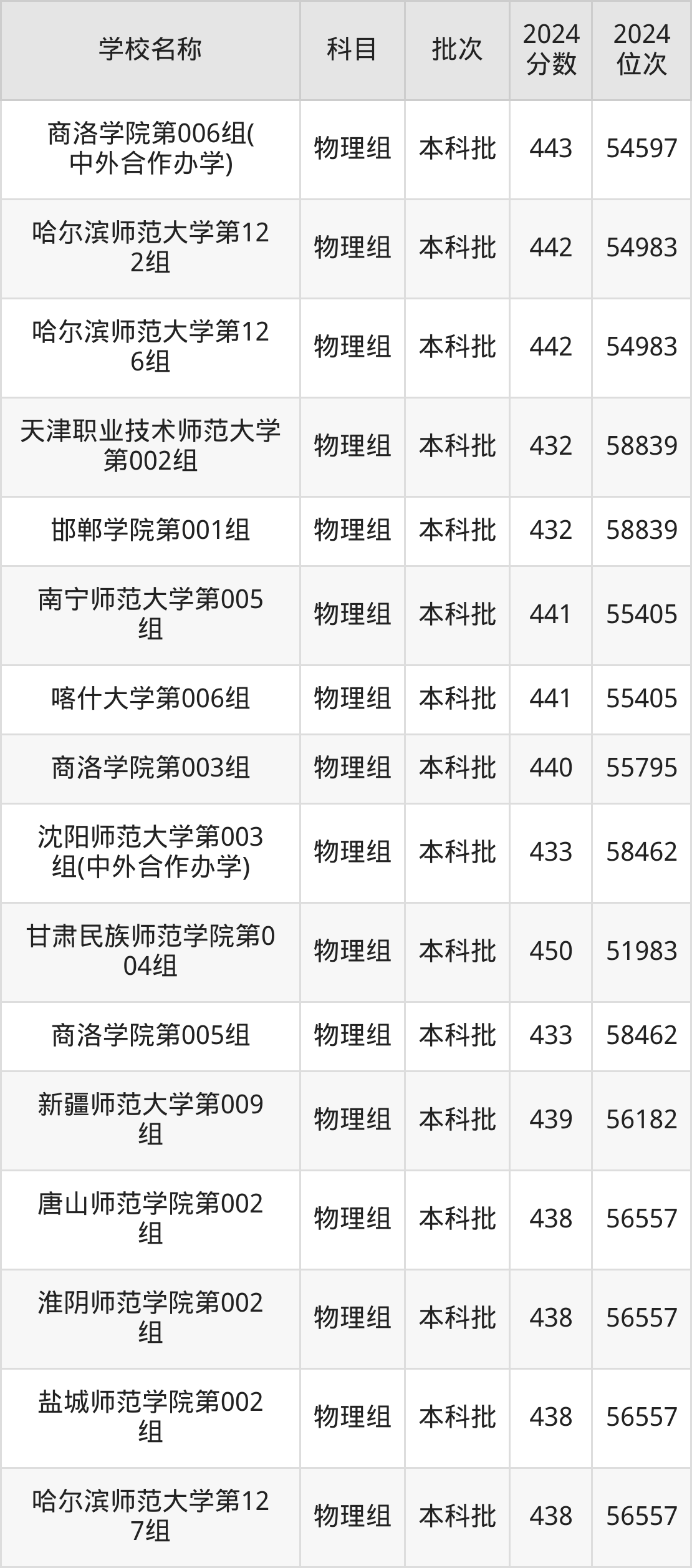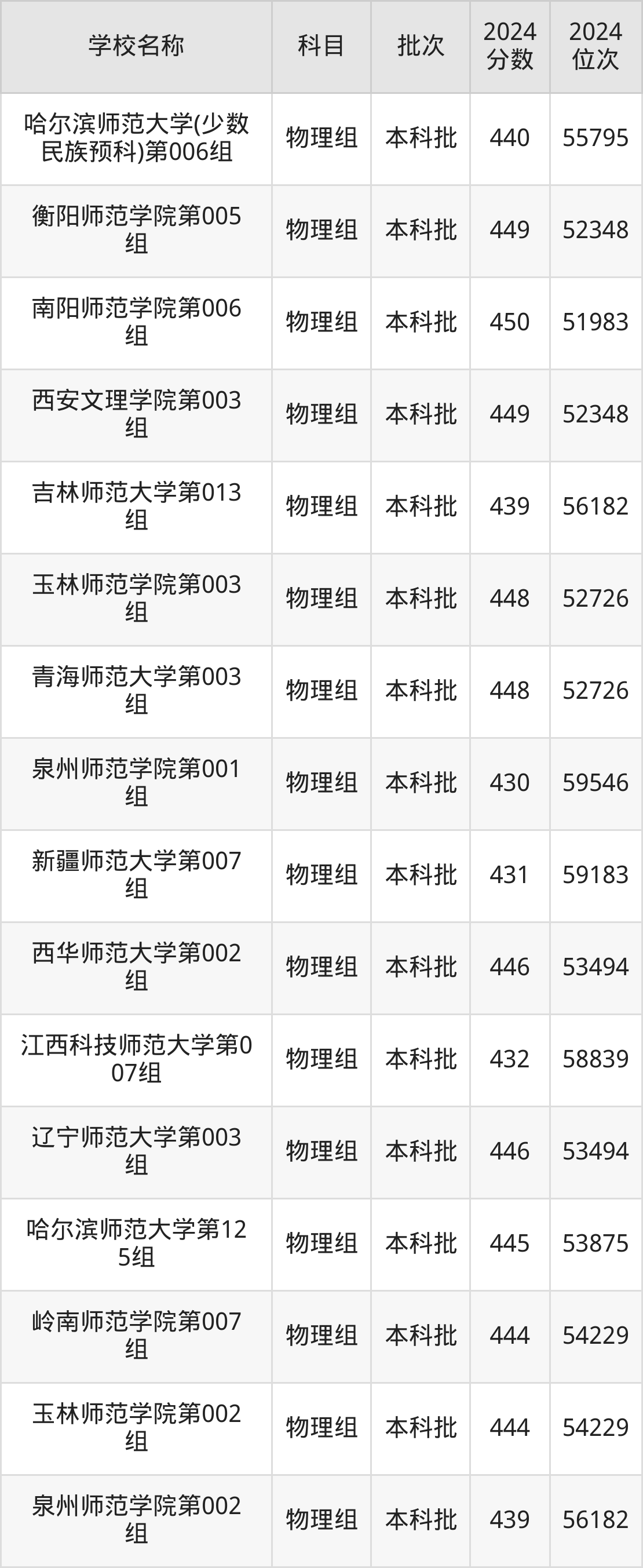 黑龙江高考物理组共有28所师范大学在430到450分之间录取,包含南阳师范学院、甘肃民族师范学院、西安文理学院、衡阳师范学院、玉林师范学院、青海师范大学、西华师范大学、辽宁师范大学、哈尔滨师范大学、岭南师范学院。