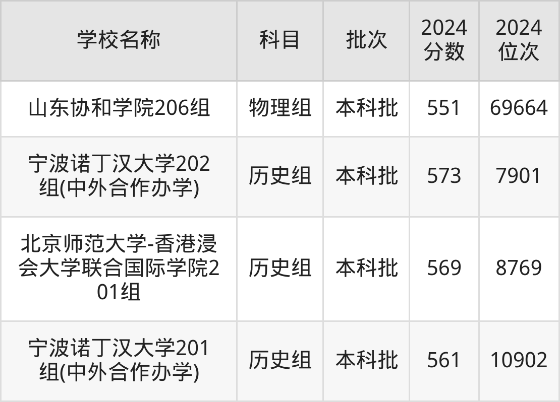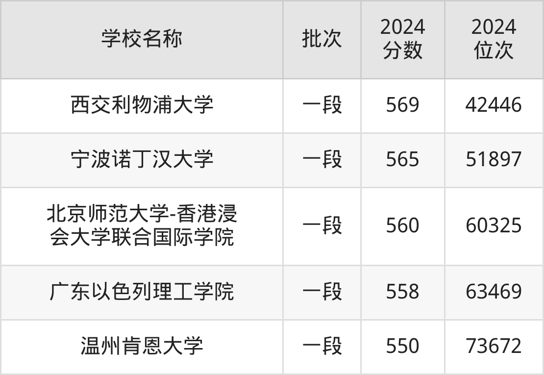 山东高考共有5所二本民办大学在550到580分之间录取,包含西交利物浦大学、宁波诺丁汉大学、北京师范大学-香港浸会大学联合国际学院、广东以色列理工学院、温州肯恩大学。