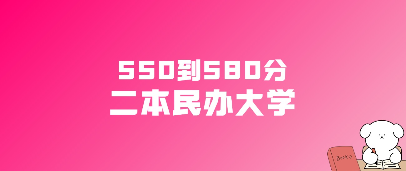 550到580分的二本民办大学有西交利物浦大学、宁波诺丁汉大学、北京师范大学-香港浸会大学联合国际学院、温州肯恩大学、山东协和学院、广东以色列理工学院、河北医科大学临床学院、衡阳师范学院南岳学院、厦门大学嘉庚学院、南京审计大学金审学院等。