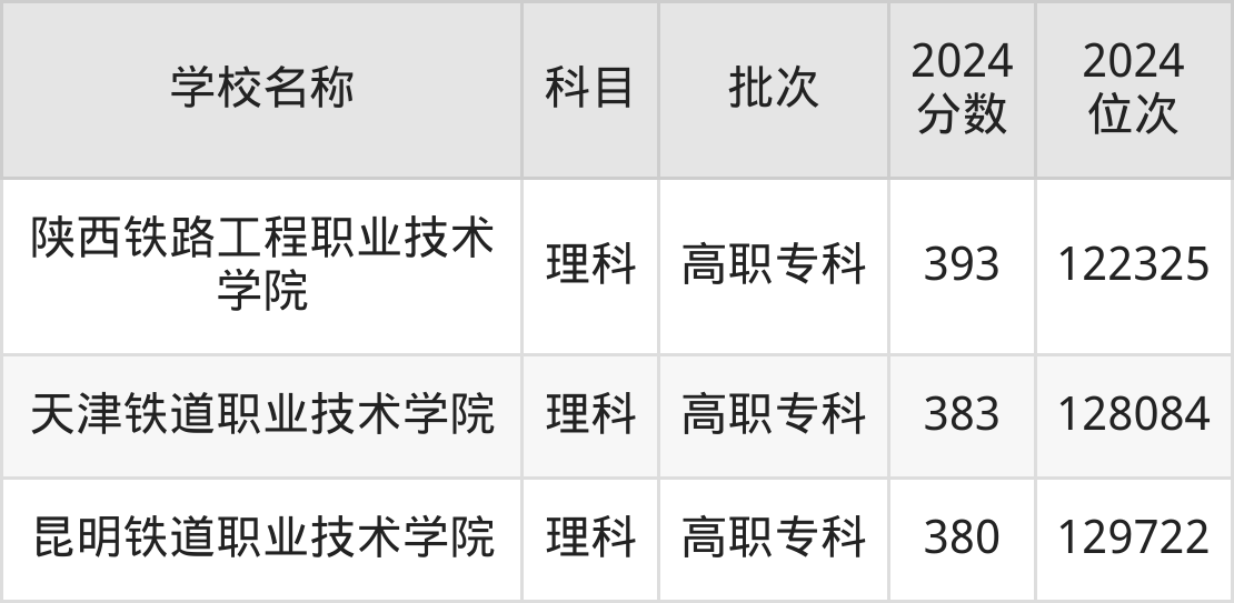 云南高考理科共有3所铁路学校在380到400分之间录取,包含陕西铁路工程职业技术学院、天津铁道职业技术学院、昆明铁道职业技术学院。