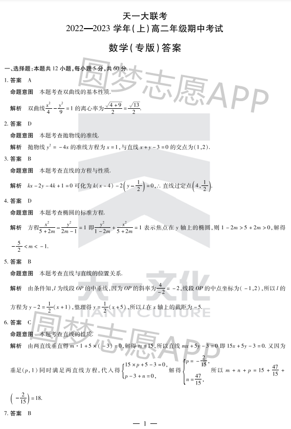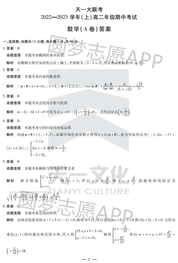 以下为天一大联考2022-2023高二期中考试数学试卷及参考答案解析汇总详细内容: