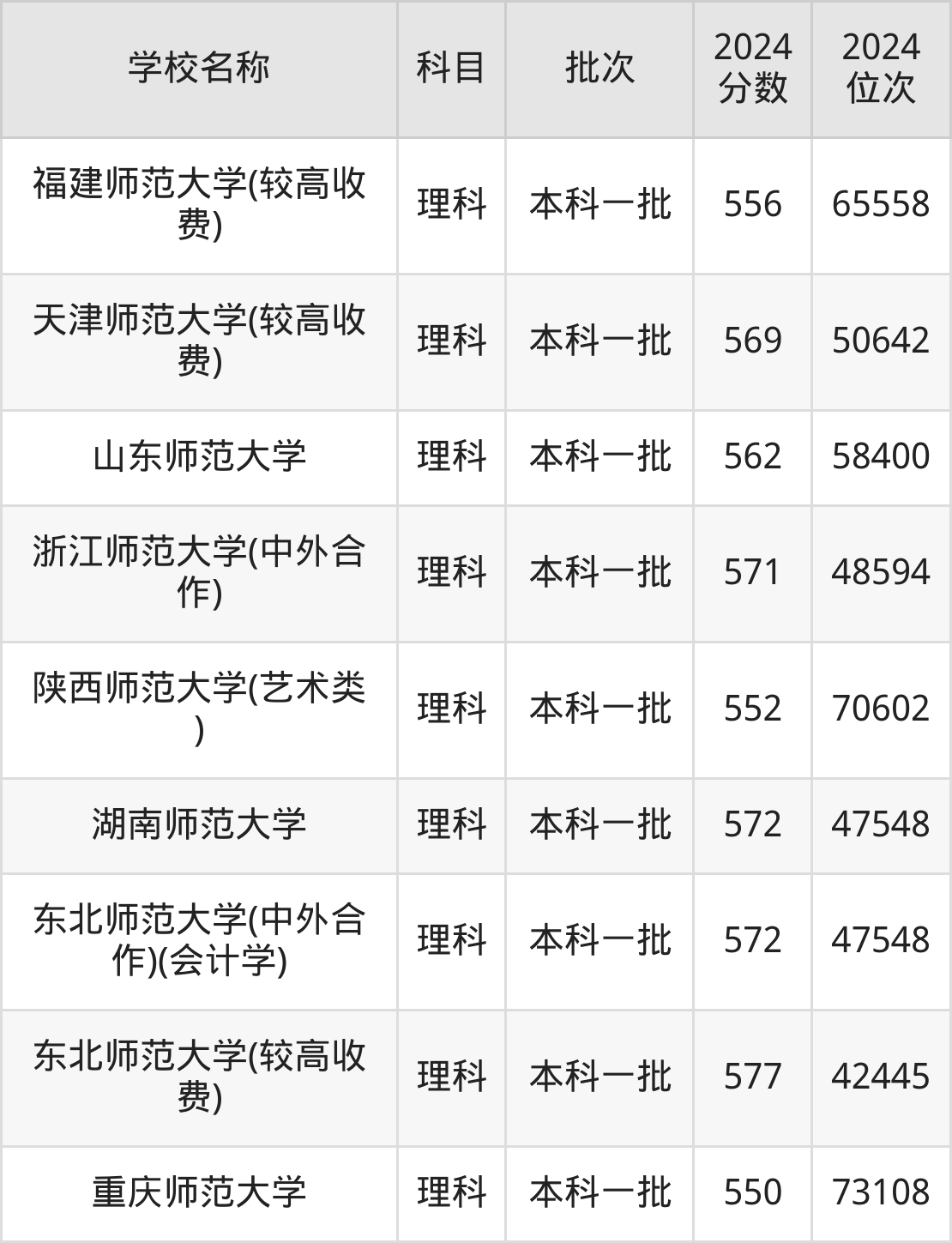 一、550到580分的师范大学最低分一览表