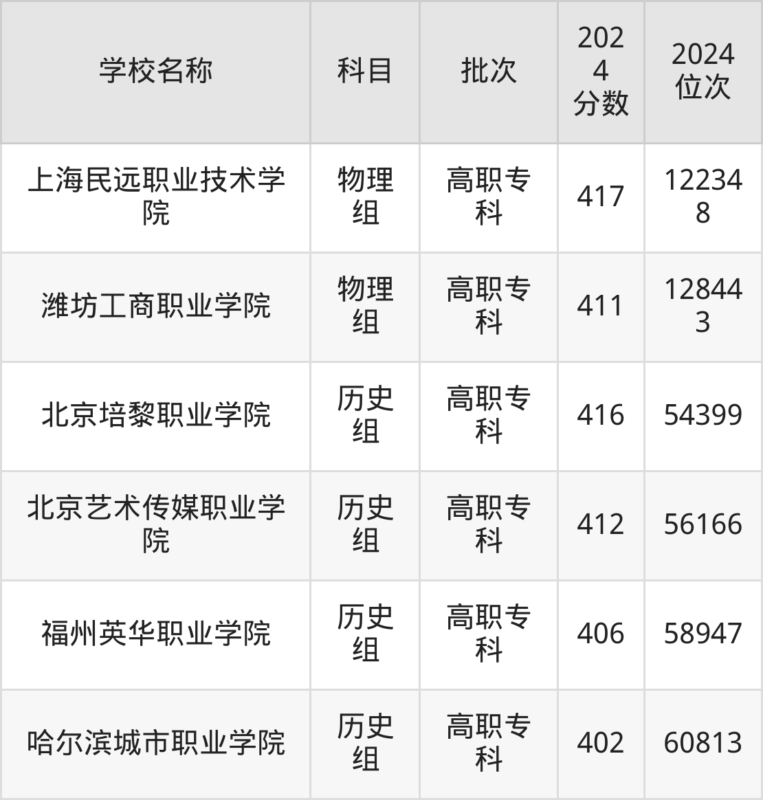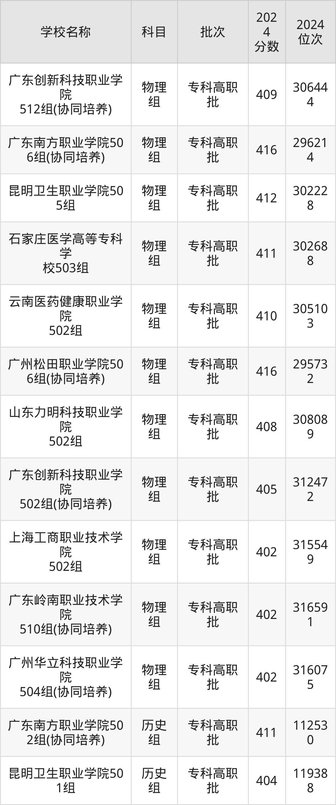 广东高考历史组共有2所民办专科学校在400到420分之间录取,包含广东南方职业学院、昆明卫生职业学院。