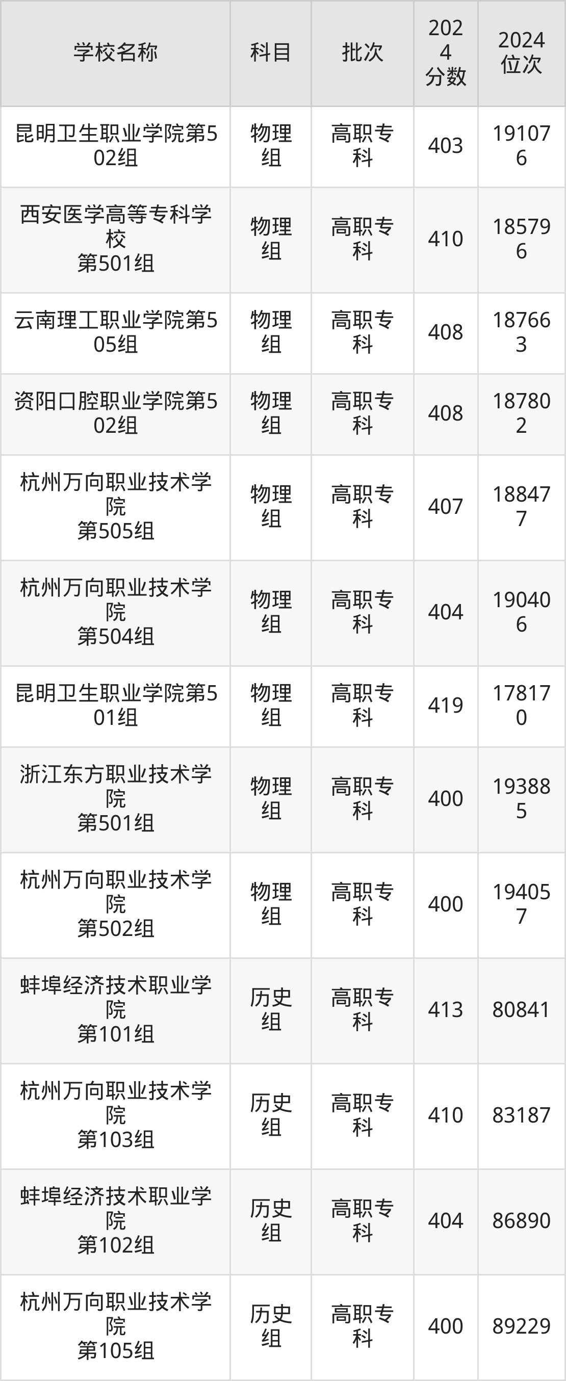 江西高考历史组共有2所民办专科学校在400到420分之间录取,包含蚌埠经济技术职业学院、杭州万向职业技术学院。