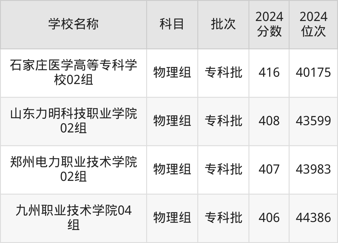 江苏高考物理组共有4所民办专科学校在400到420分之间录取,包含石家庄医学高等专科学校、山东力明科技职业学院、郑州电力职业技术学院、九州职业技术学院。