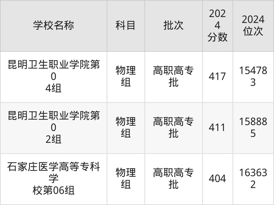 湖北高考物理组共有2所民办专科学校在400到420分之间录取,包含昆明卫生职业学院、石家庄医学高等专科学校。