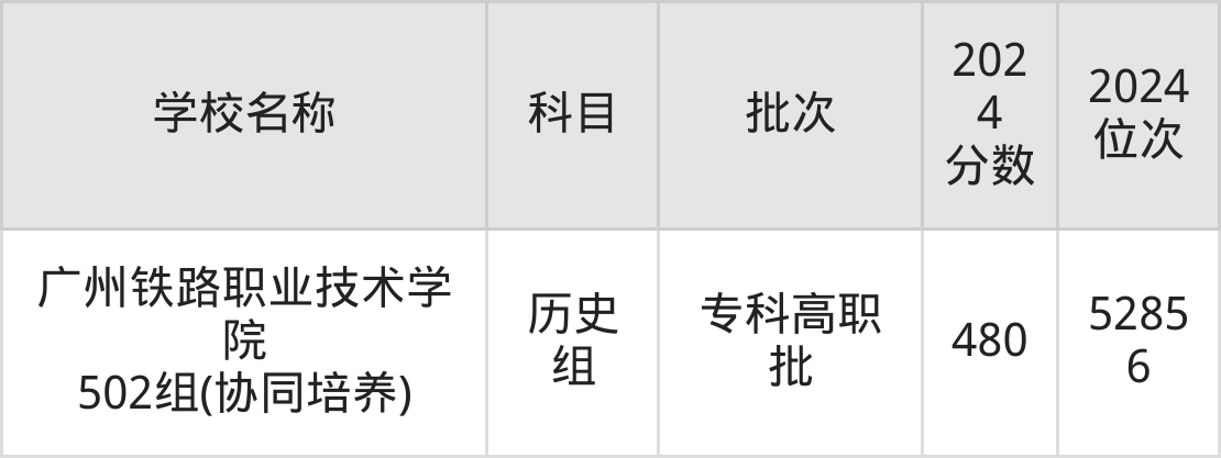 广东高考历史组共有1所铁路专科学校在470到480分之间录取,包含广州铁路职业技术学院。