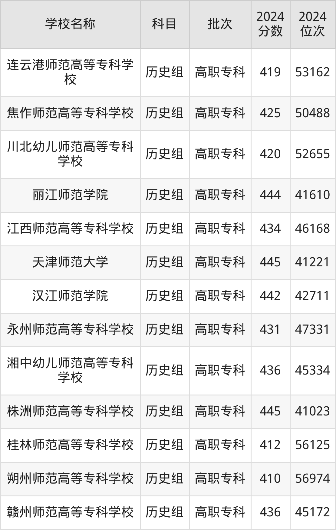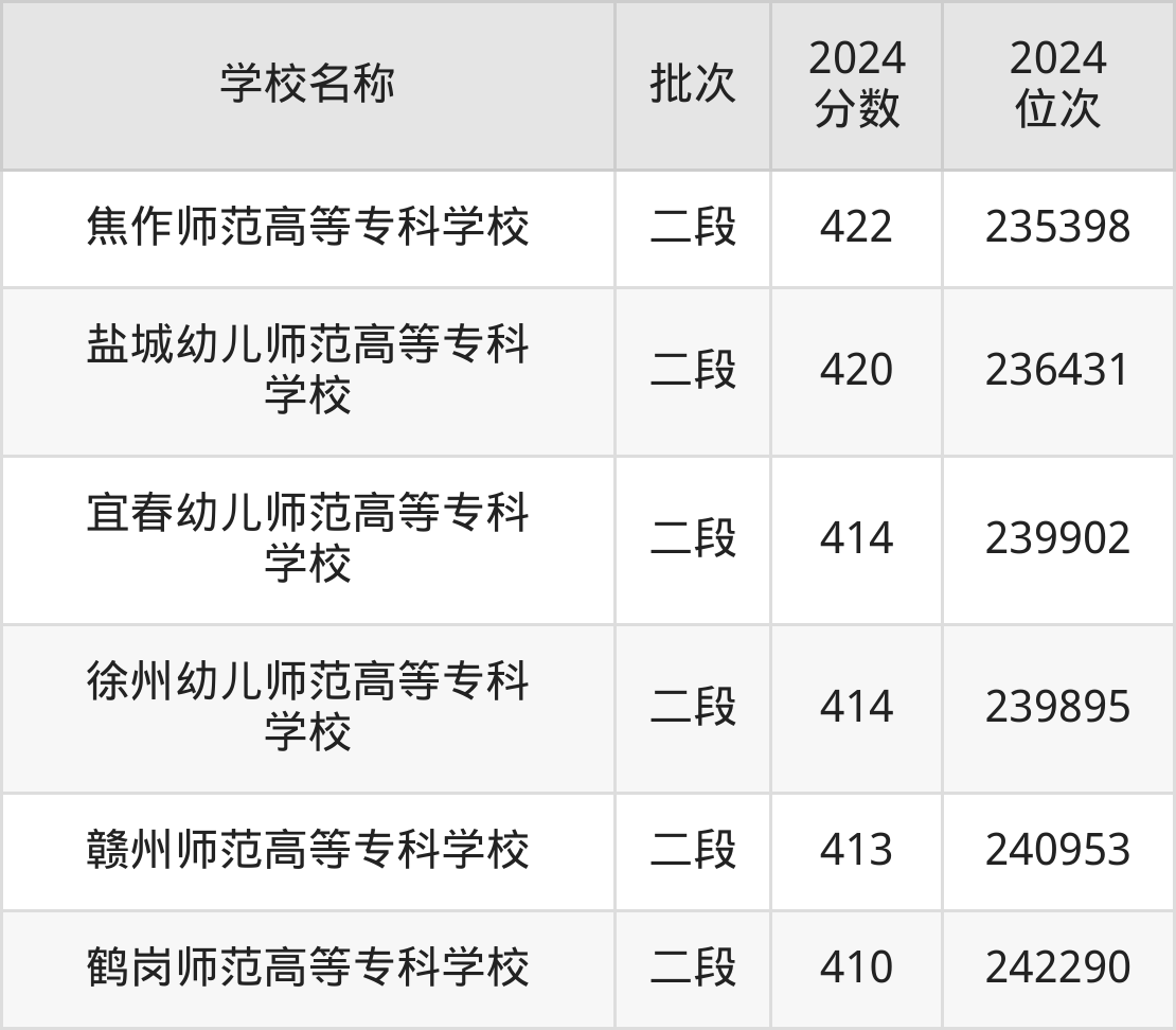 浙江高考共有6所师范大学在410到450分之间录取,包含焦作师范高等专科学校、盐城幼儿师范高等专科学校、宜春幼儿师范高等专科学校、徐州幼儿师范高等专科学校、赣州师范高等专科学校、鹤岗师范高等专科学校。