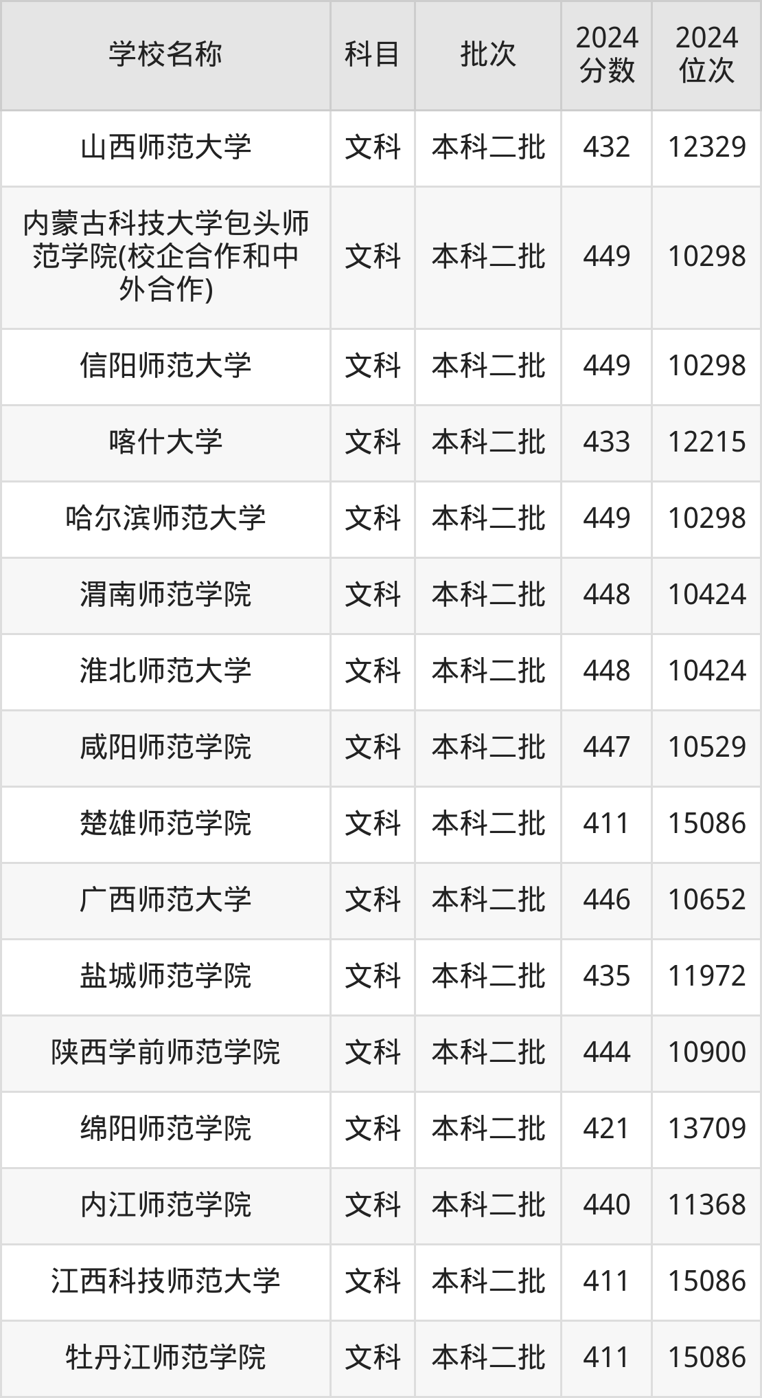 内蒙古高考文科共有44所师范大学在410到450分之间录取,包含湖州师范学院、信阳师范大学、内蒙古科技大学包头师范学院(校企合作和中外合作)、哈尔滨师范大学、渭南师范学院、淮北师范大学、咸阳师范学院、广西师范大学、阜阳师范大学、陕西学前师范学院。