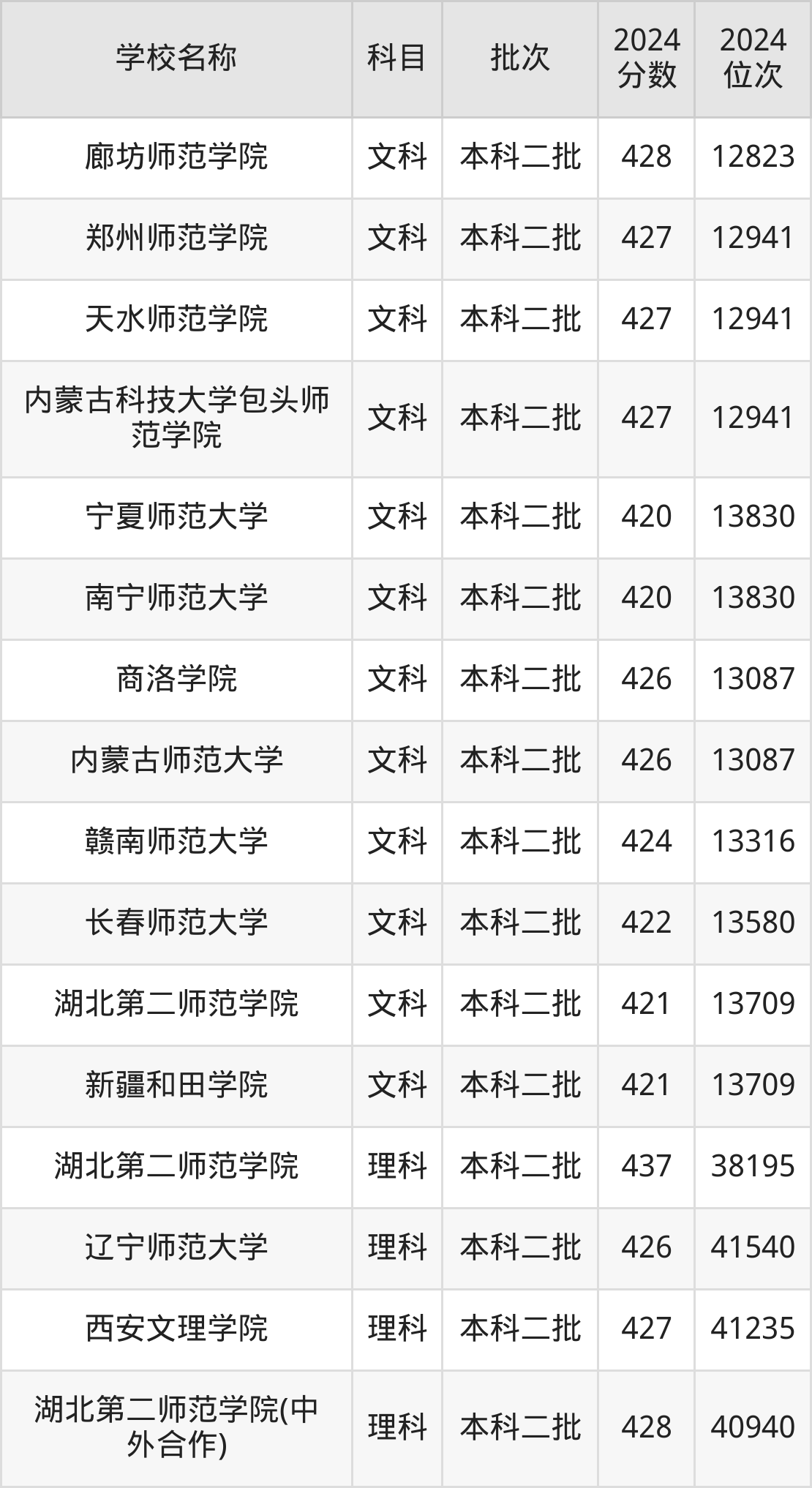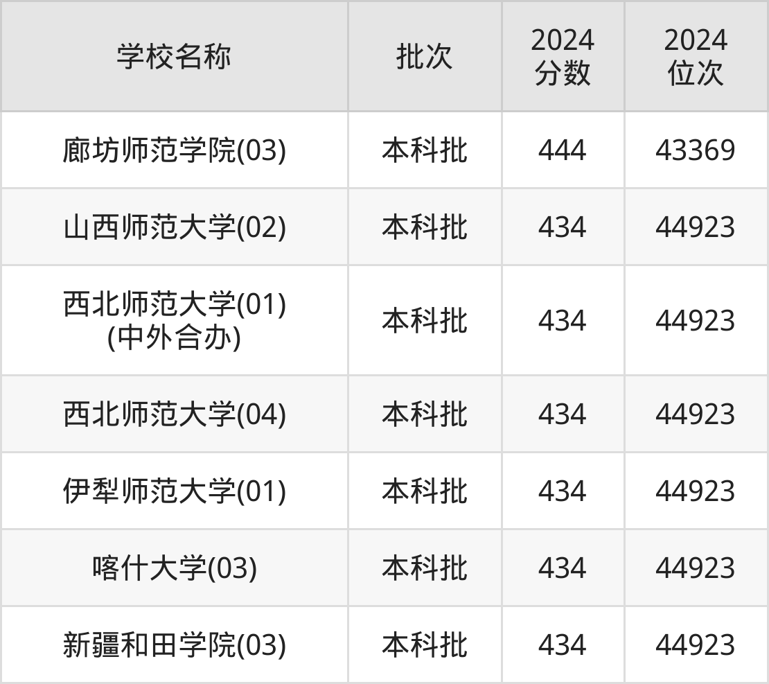 北京高考共有6所师范大学在410到450分之间录取,包含廊坊师范学院、山西师范大学、西北师范大学、伊犁师范大学、喀什大学、新疆和田学院。