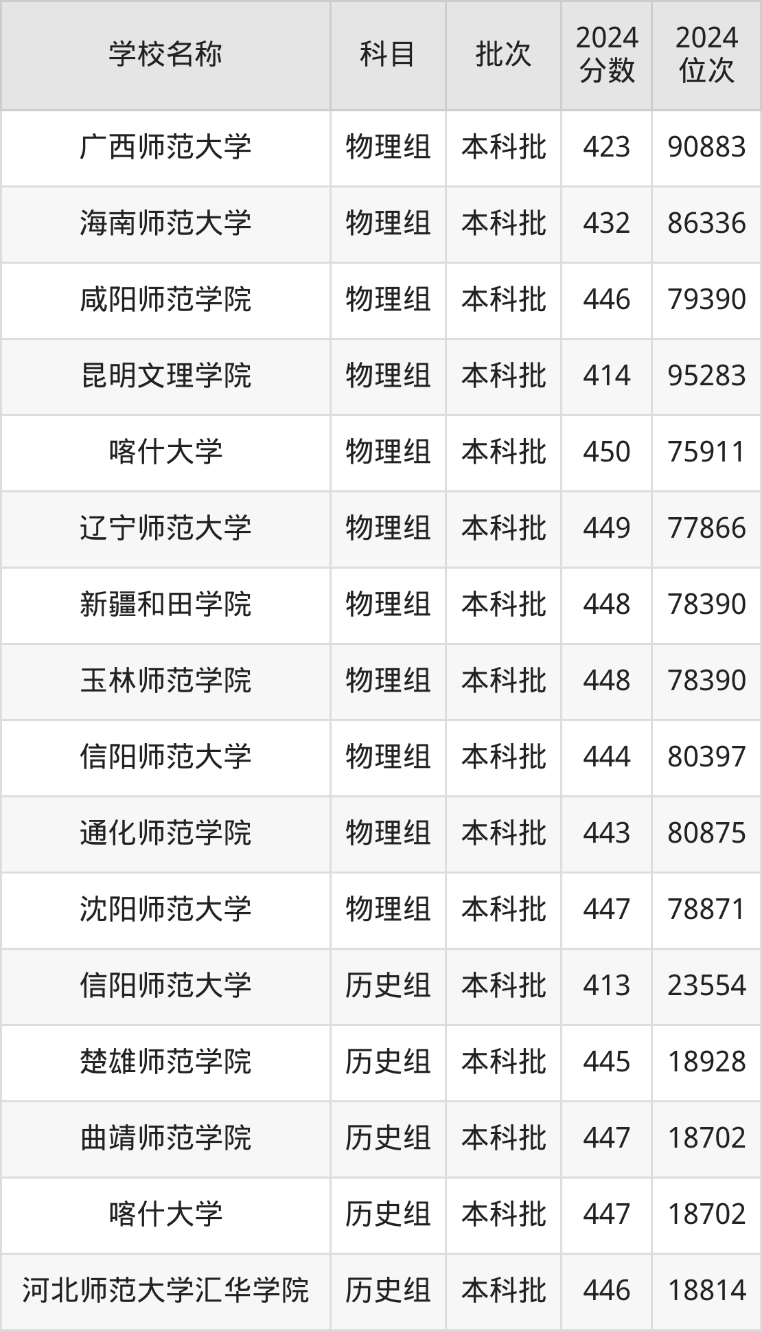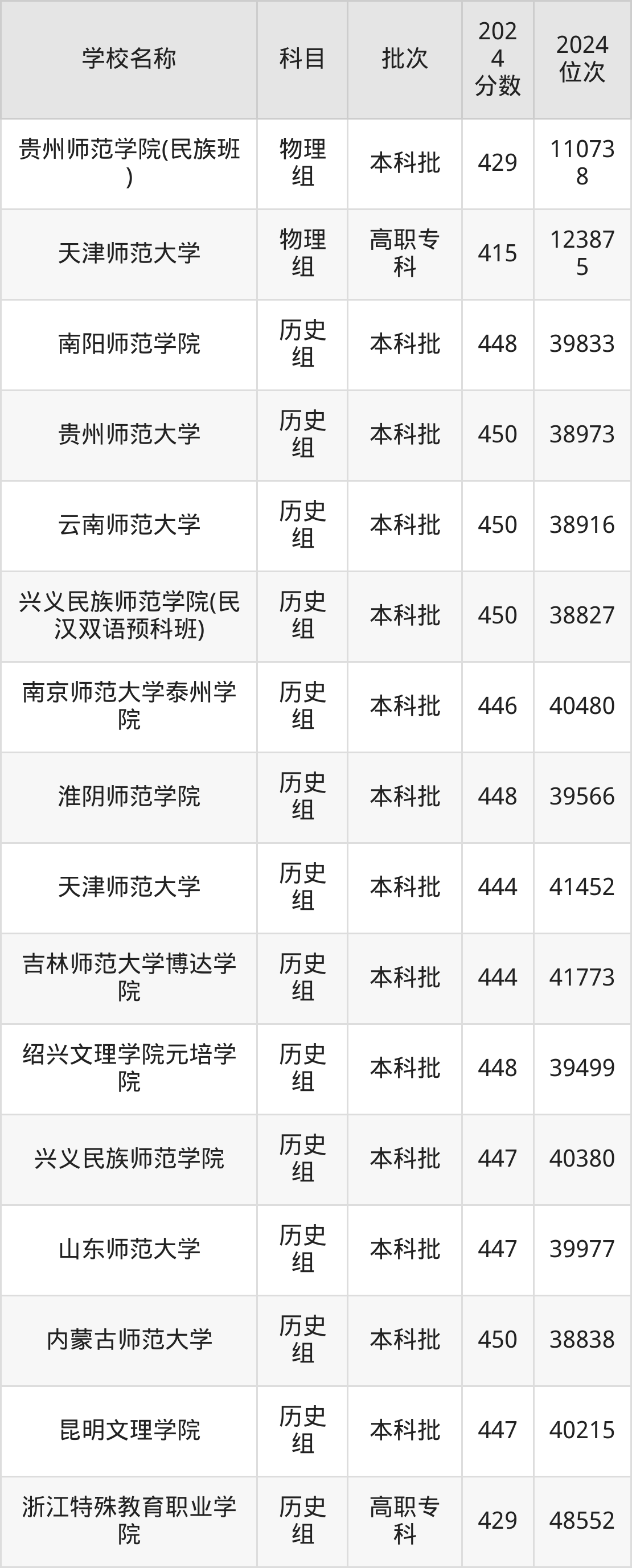 贵州高考历史组共有26所师范大学在410到450分之间录取,包含贵州师范大学、云南师范大学、兴义民族师范学院(民汉双语预科班)、内蒙古师范大学、南阳师范学院、淮阴师范学院、绍兴文理学院元培学院、山东师范大学、兴义民族师范学院、昆明文理学院。