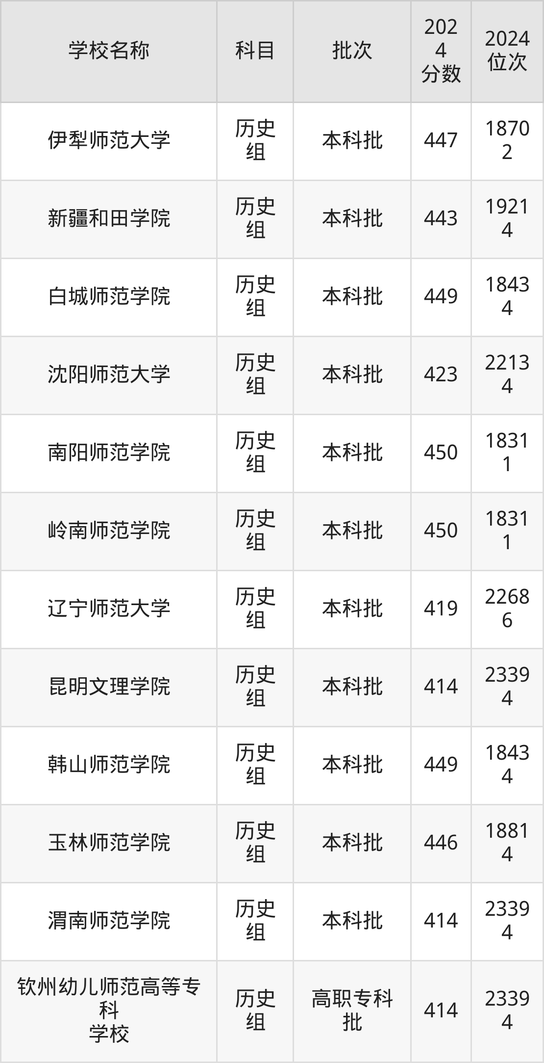 辽宁高考历史组共有17所师范大学在410到450分之间录取,包含南阳师范学院、岭南师范学院、韩山师范学院、白城师范学院、伊犁师范大学、喀什大学、曲靖师范学院、玉林师范学院、河北师范大学汇华学院、楚雄师范学院。