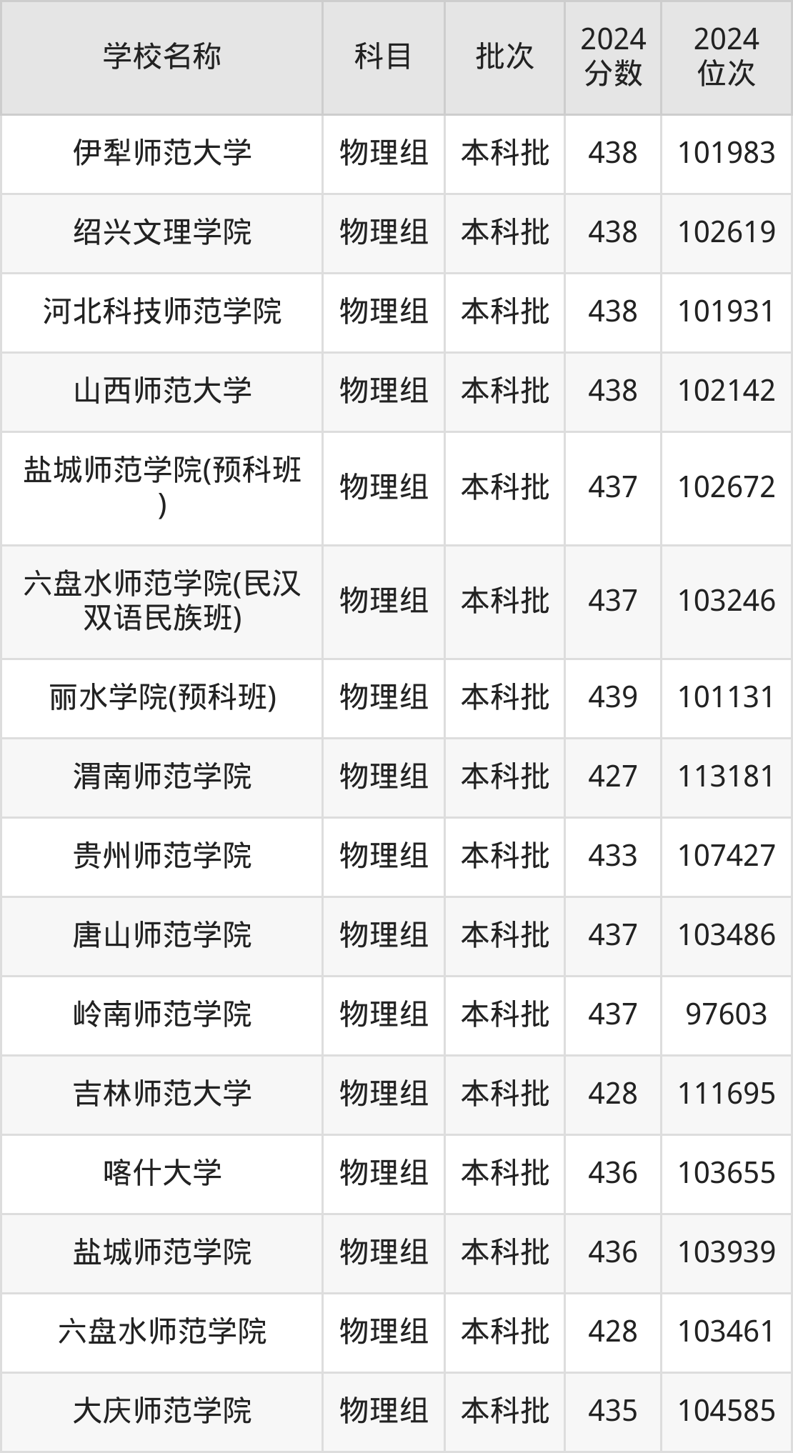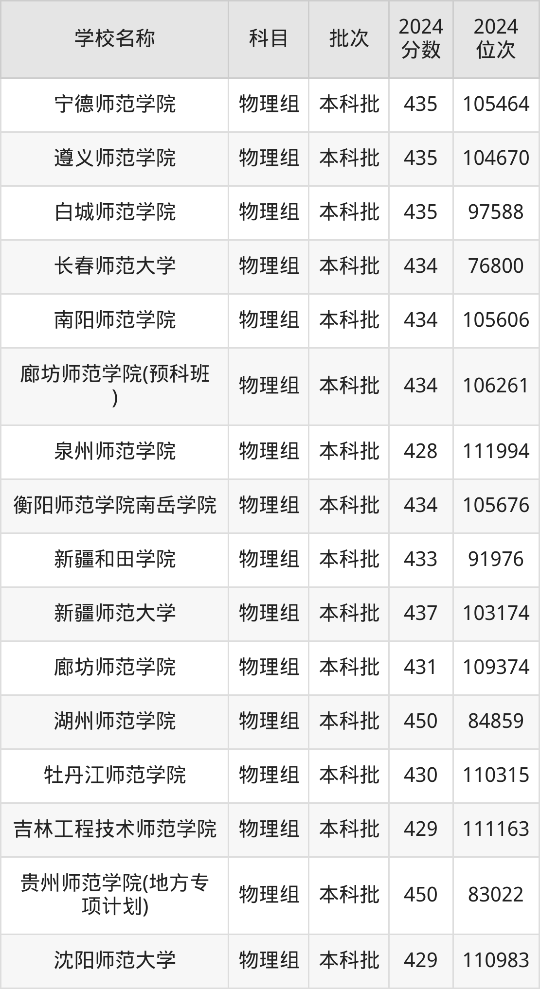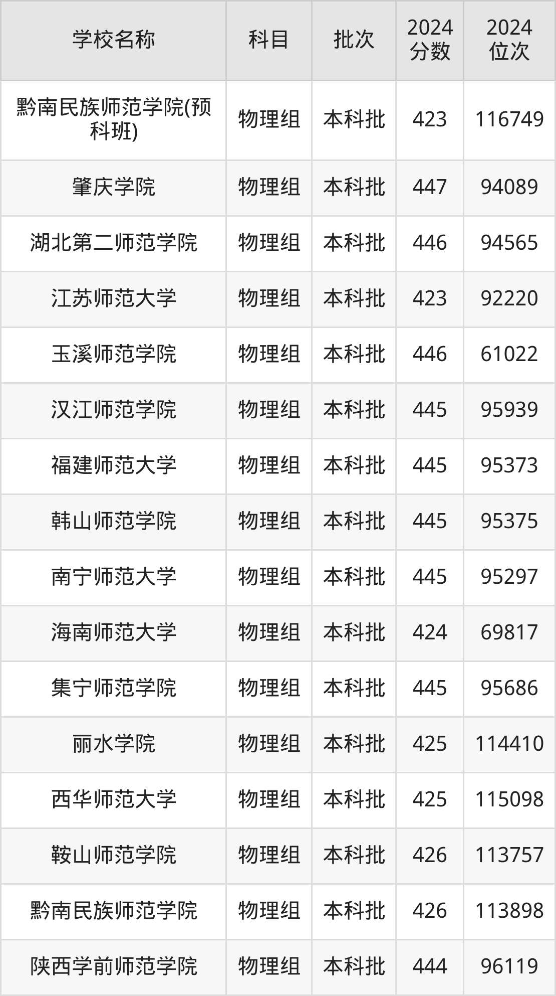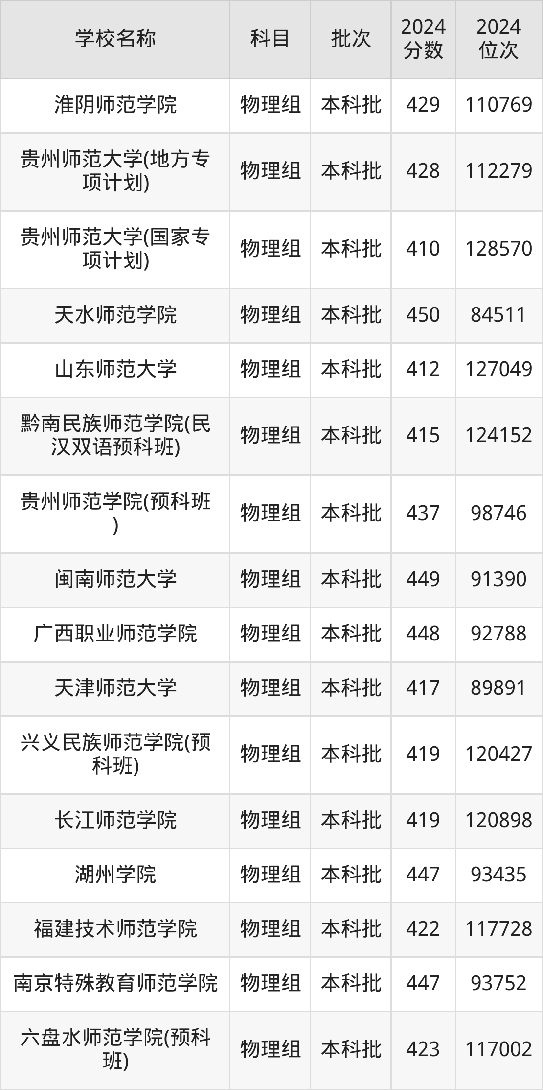 贵州高考物理组共有81所师范大学在410到450分之间录取,包含贵州师范学院(地方专项计划)、湖州师范学院、天水师范学院、闽南师范大学、广西职业师范学院、湖州学院、南京特殊教育师范学院、肇庆学院、湖北第二师范学院、玉溪师范学院。