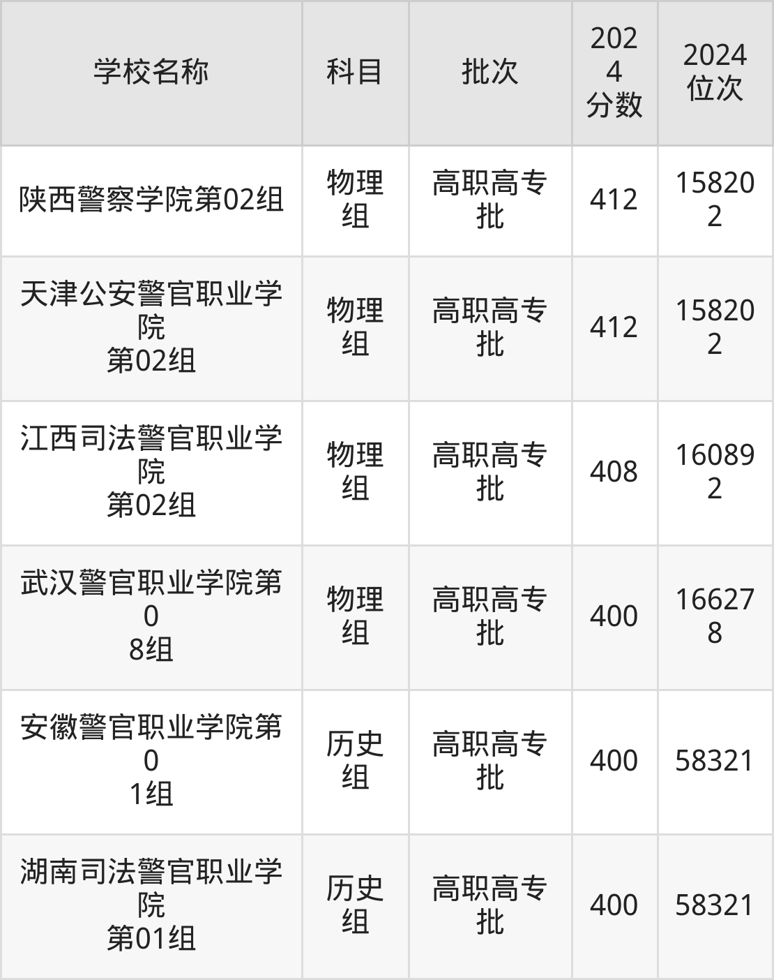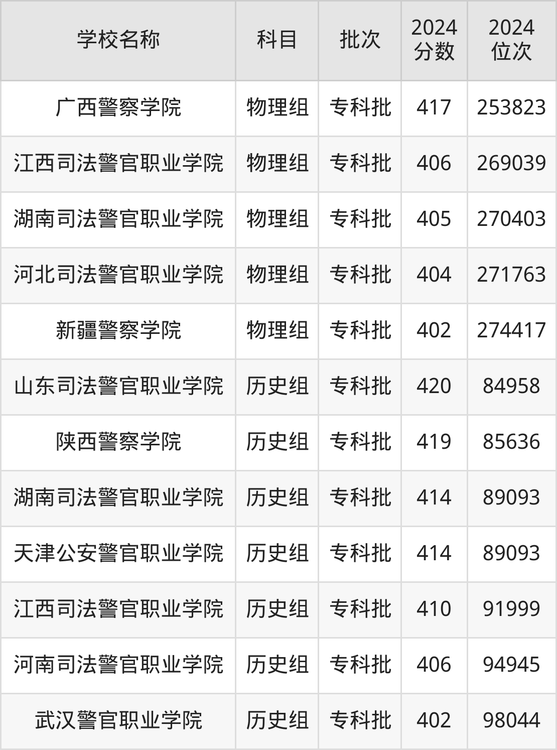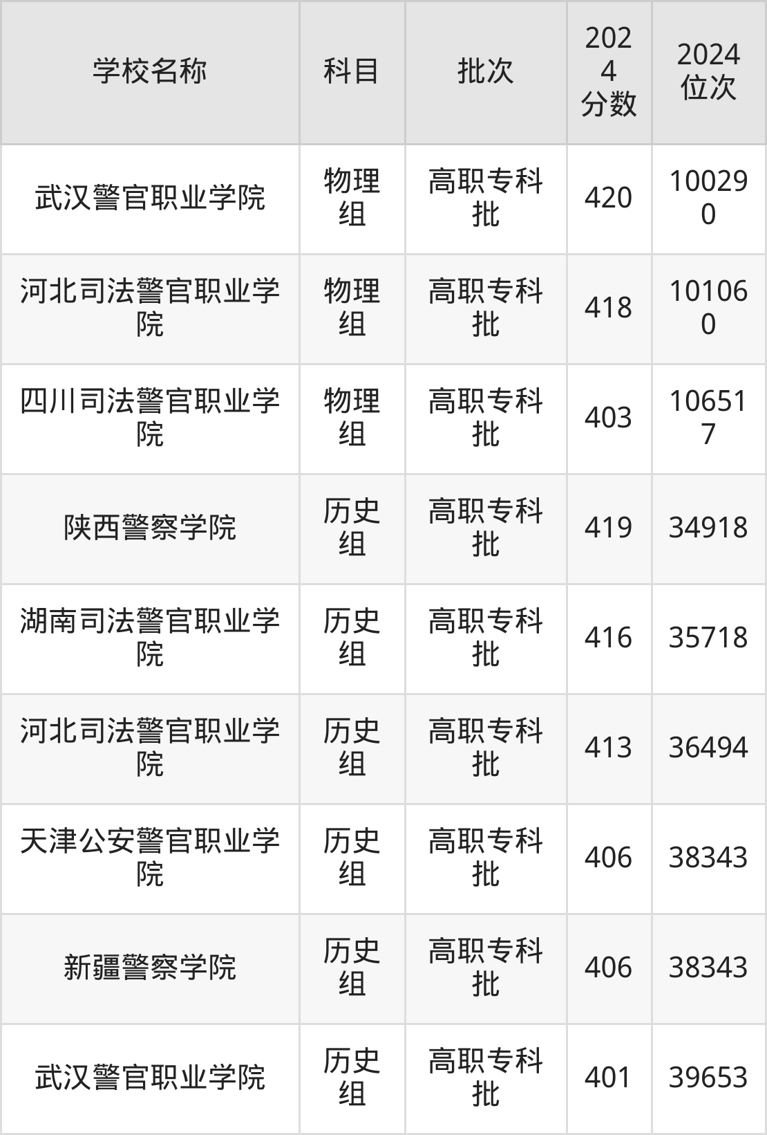 湖北高考历史组共有2所公安警校在400到420分之间录取,包含安徽警官职业学院、湖南司法警官职业学院。
