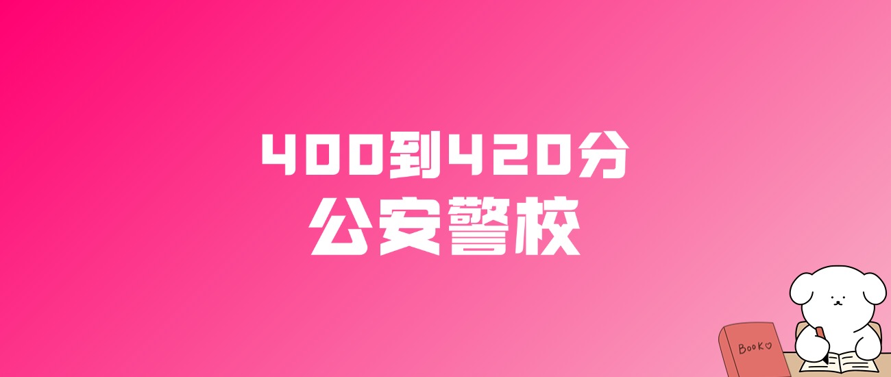 400到420分的公安警校有河南司法警官职业学院、江西司法警官职业学院、安徽警官职业学院、湖南司法警官职业学院、陕西警察学院、天津公安警官职业学院、武汉警官职业学院、山东司法警官职业学院、广西警察学院、河北司法警官职业学院等。