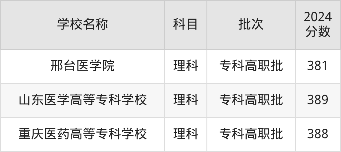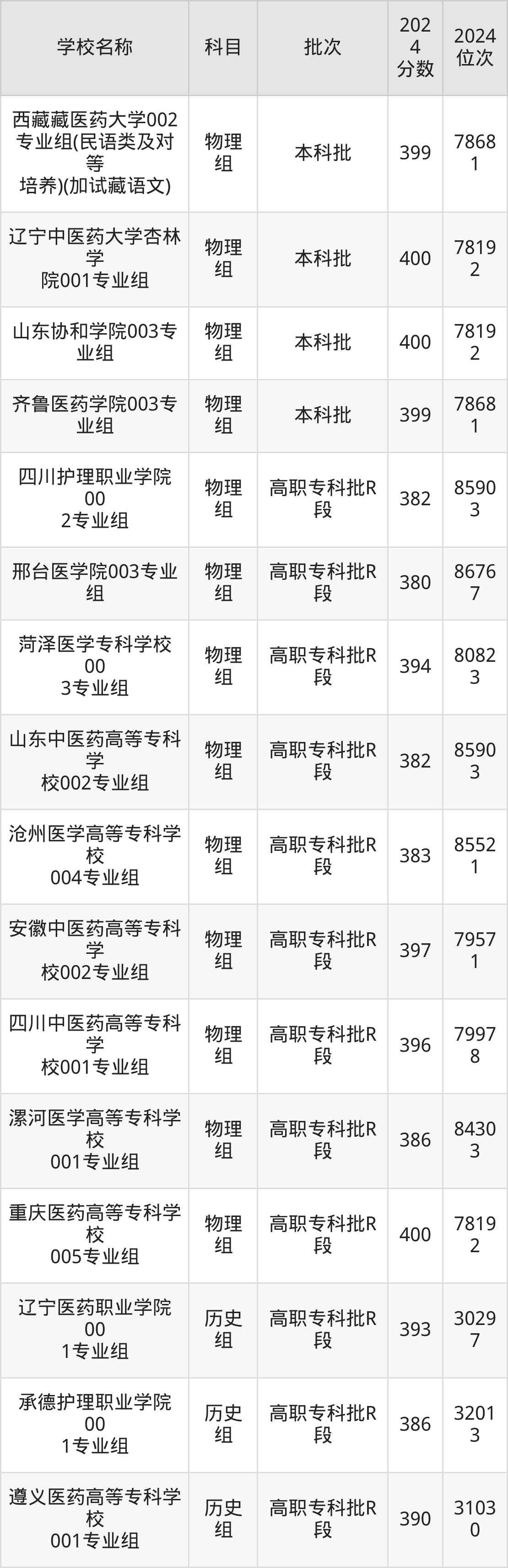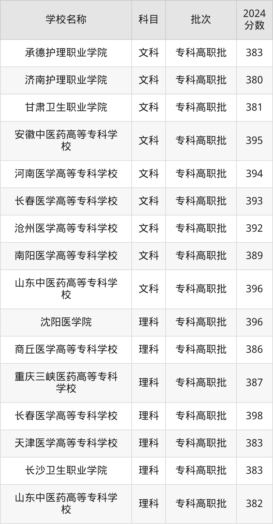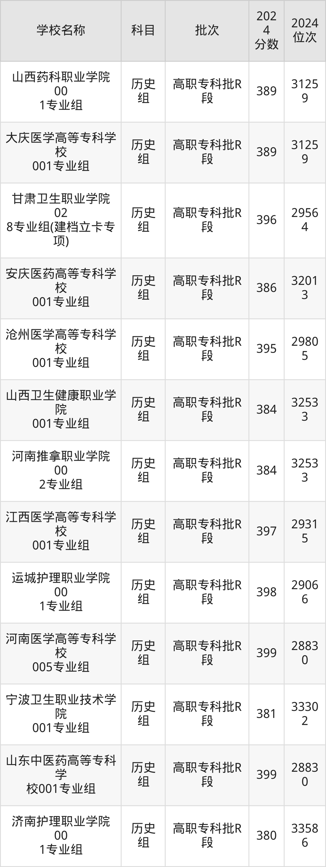 甘肃高考历史组共有16所医科大学在380到400分之间录取,包含山东中医药高等专科学校、河南医学高等专科学校、运城护理职业学院、江西医学高等专科学校、甘肃卫生职业学院、沧州医学高等专科学校、辽宁医药职业学院、遵义医药高等专科学校、山西药科职业学院、大庆医学高等专科学校。