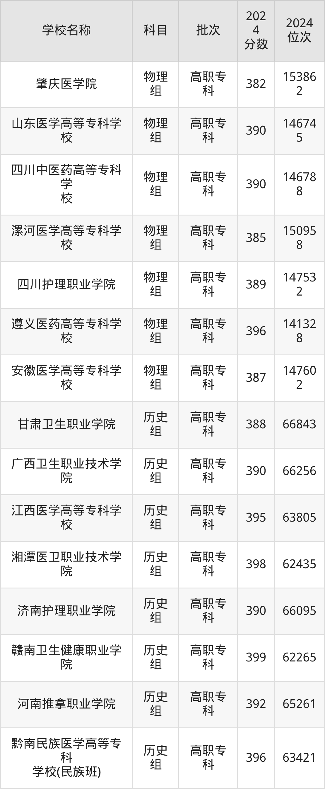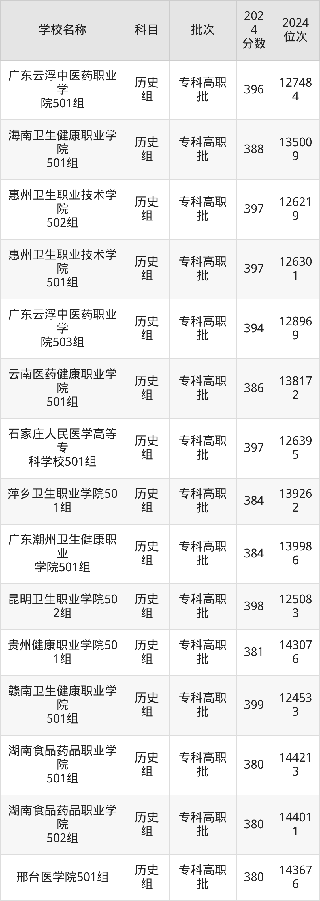贵州高考历史组共有8所医科大学在380到400分之间录取,包含赣南卫生健康职业学院、湘潭医卫职业技术学院、黔南民族医学高等专科学校(民族班)、江西医学高等专科学校、河南推拿职业学院、济南护理职业学院、广西卫生职业技术学院、甘肃卫生职业学院。