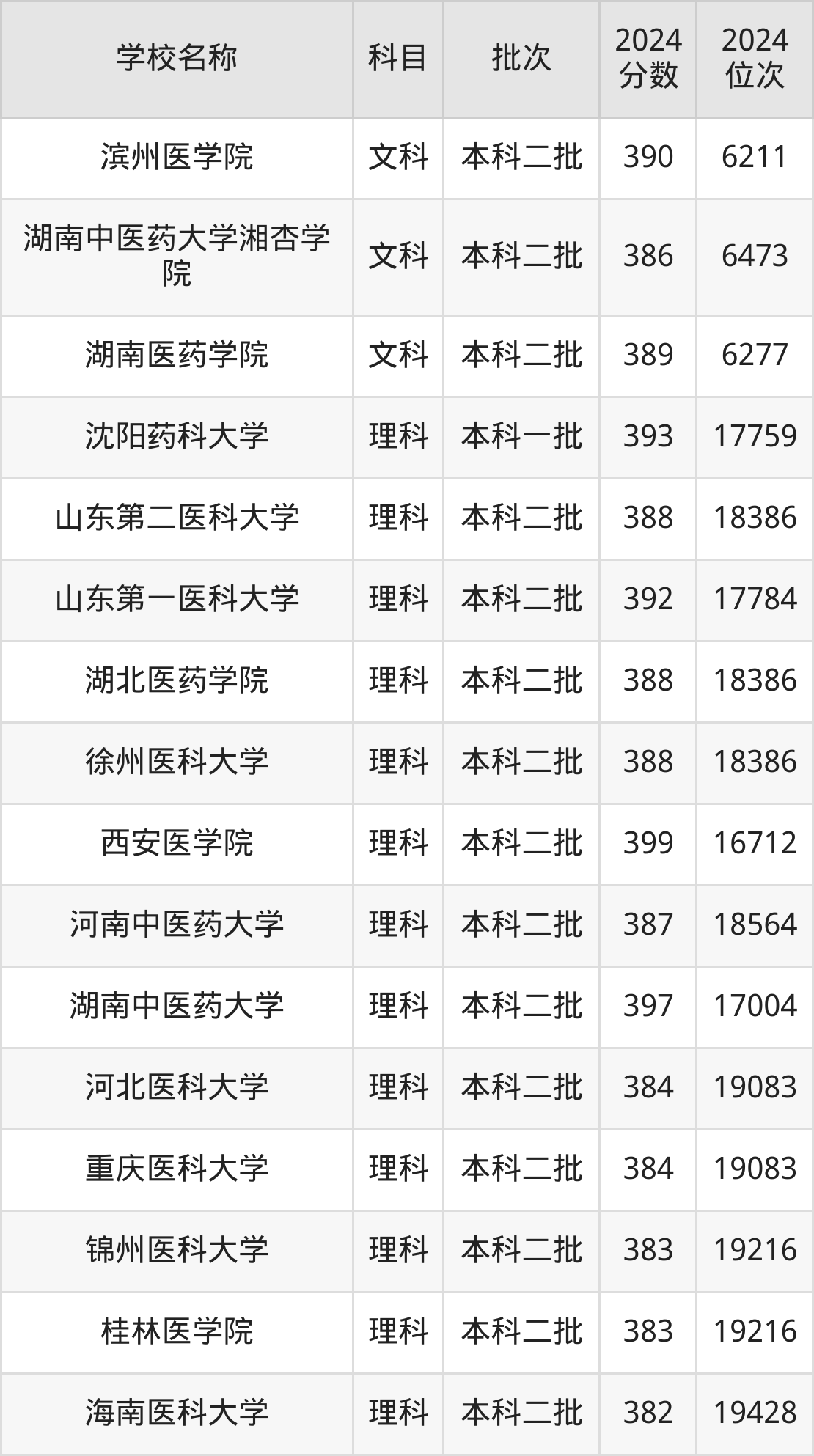 新疆高考文科共有3所医科大学在380到400分之间录取,包含滨州医学院、湖南医药学院、湖南中医药大学湘杏学院。