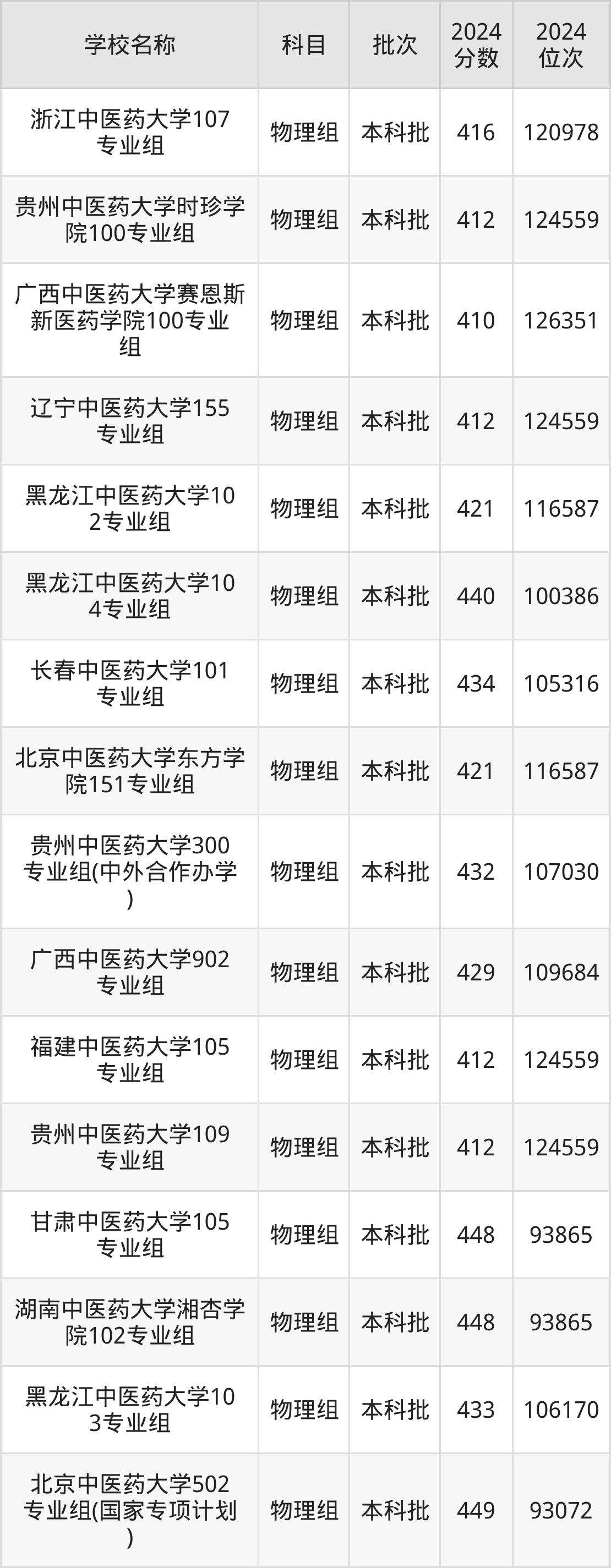 广西高考物理组共有14所中医药大学在410到450分之间录取,包含北京中医药大学、湖南中医药大学湘杏学院、甘肃中医药大学、黑龙江中医药大学、长春中医药大学、贵州中医药大学、广西中医药大学、湖北中医药高等专科学校、北京中医药大学东方学院、广西中医药大学赛恩斯新医药学院。