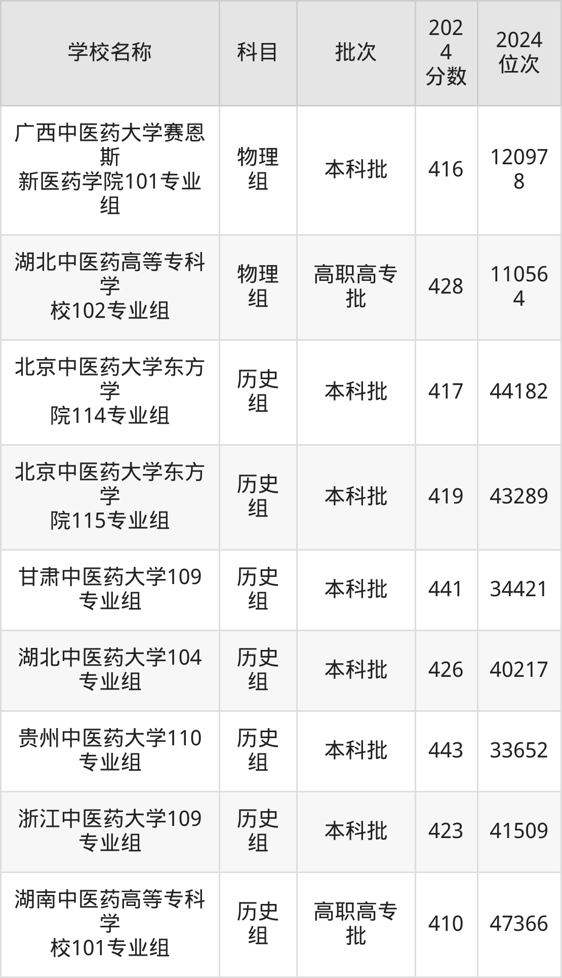 广西高考历史组共有6所中医药大学在410到450分之间录取,包含贵州中医药大学、甘肃中医药大学、湖北中医药大学、浙江中医药大学、北京中医药大学东方学院、湖南中医药高等专科学校。