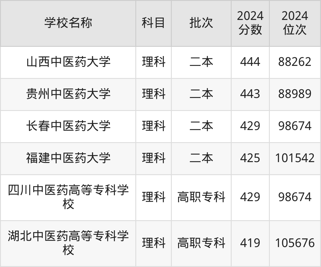 云南高考理科共有6所中医药大学在410到450分之间录取,包含山西中医药大学、贵州中医药大学、长春中医药大学、四川中医药高等专科学校、福建中医药大学、湖北中医药高等专科学校。