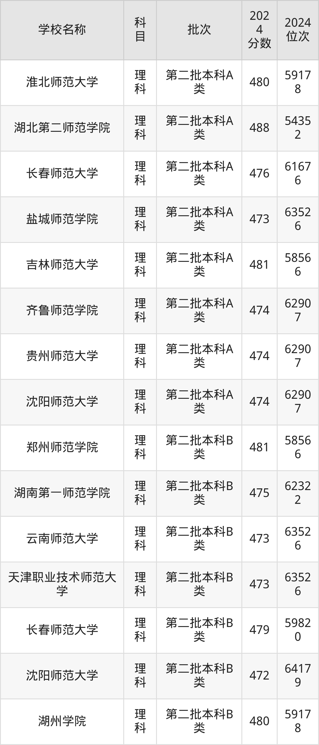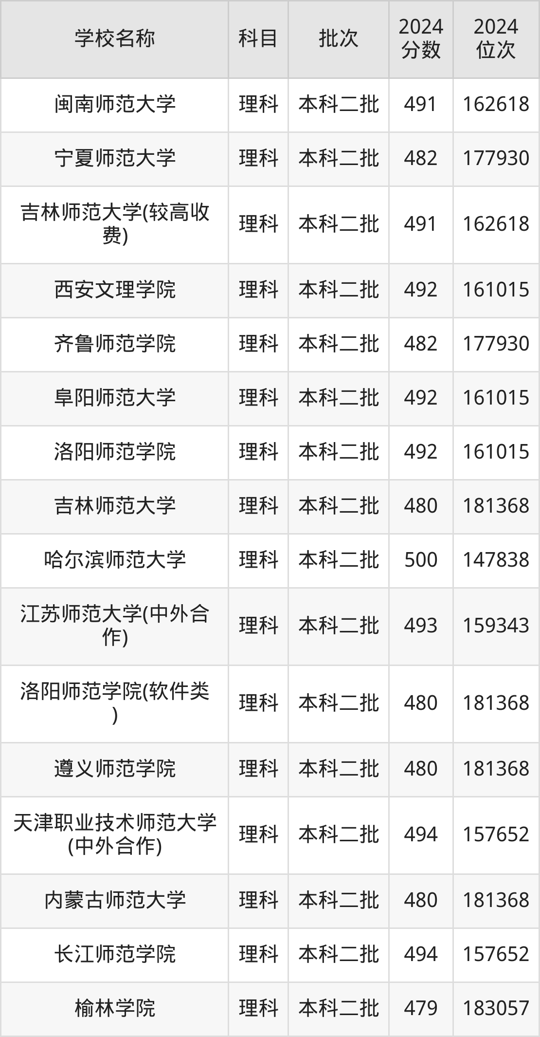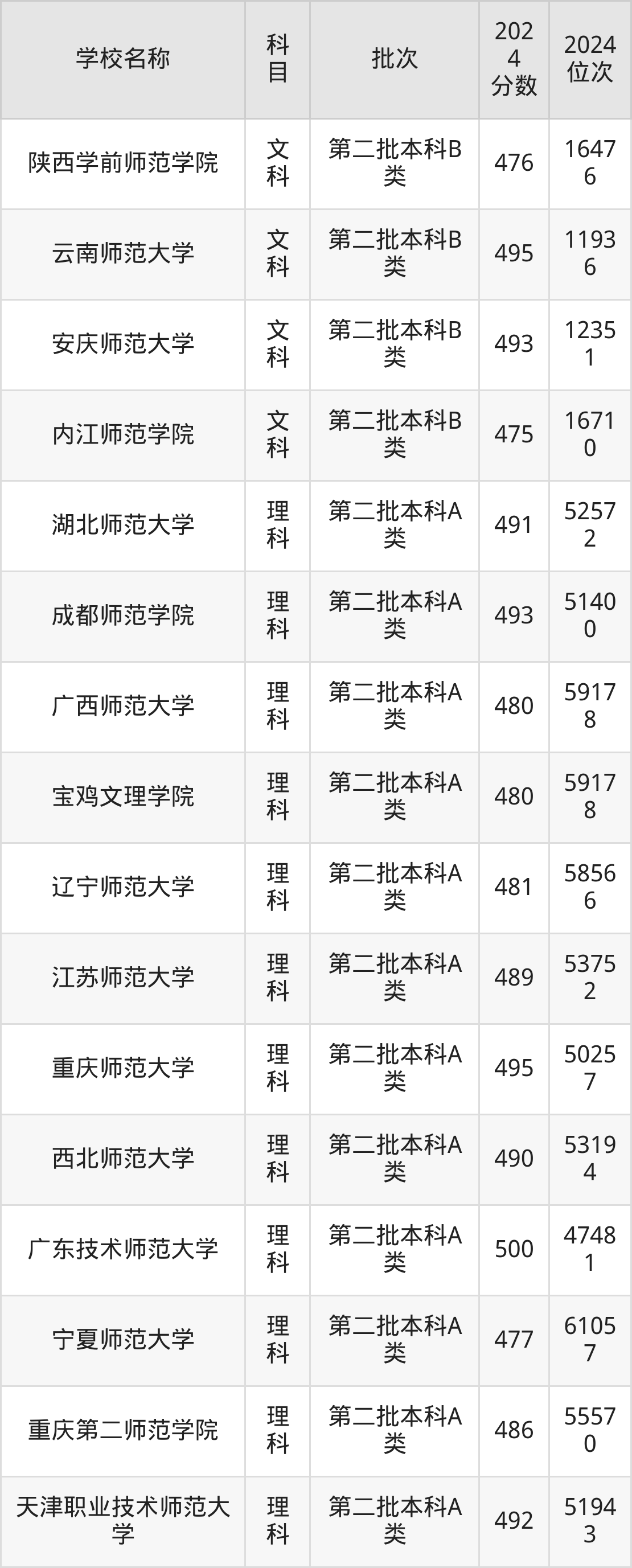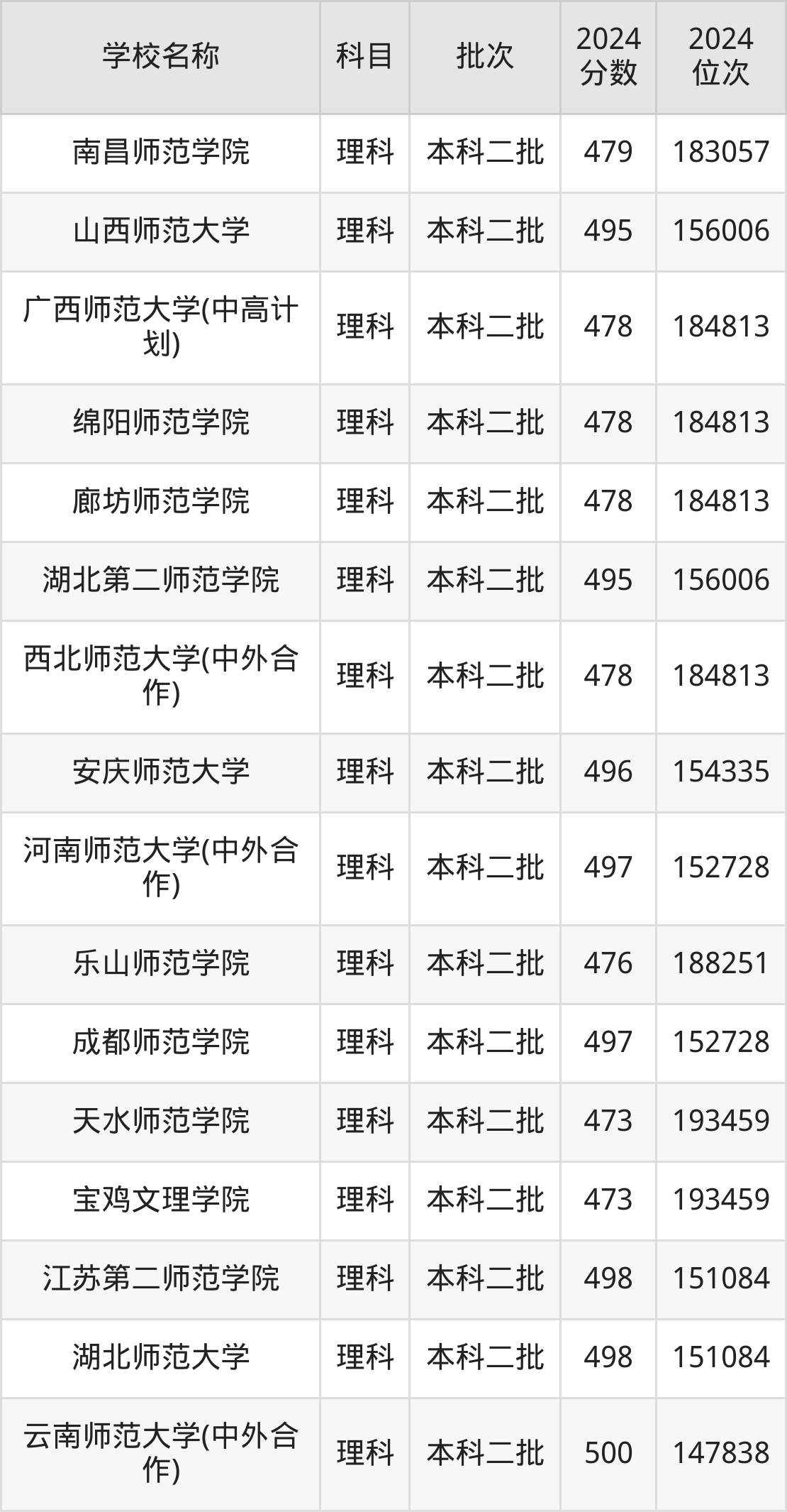 山西高考理科共有24所师范大学在470到500分之间录取,包含广东技术师范大学、重庆师范大学、成都师范学院、天津职业技术师范大学、湖北师范大学、西北师范大学、江苏师范大学、湖北第二师范学院、重庆第二师范学院、辽宁师范大学。