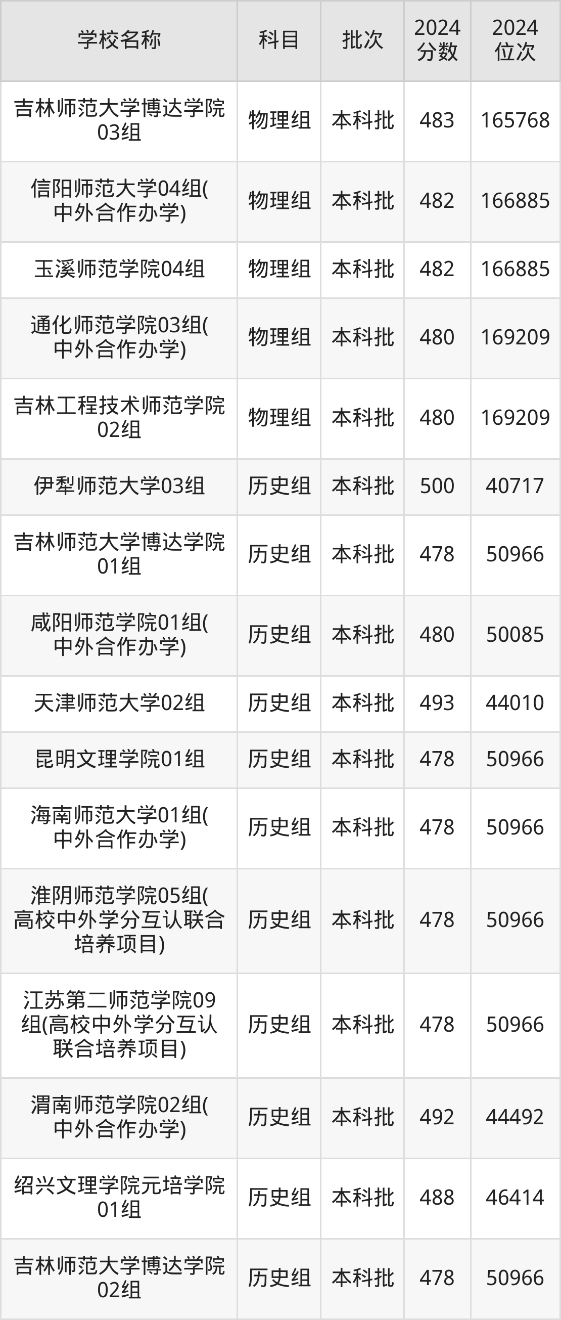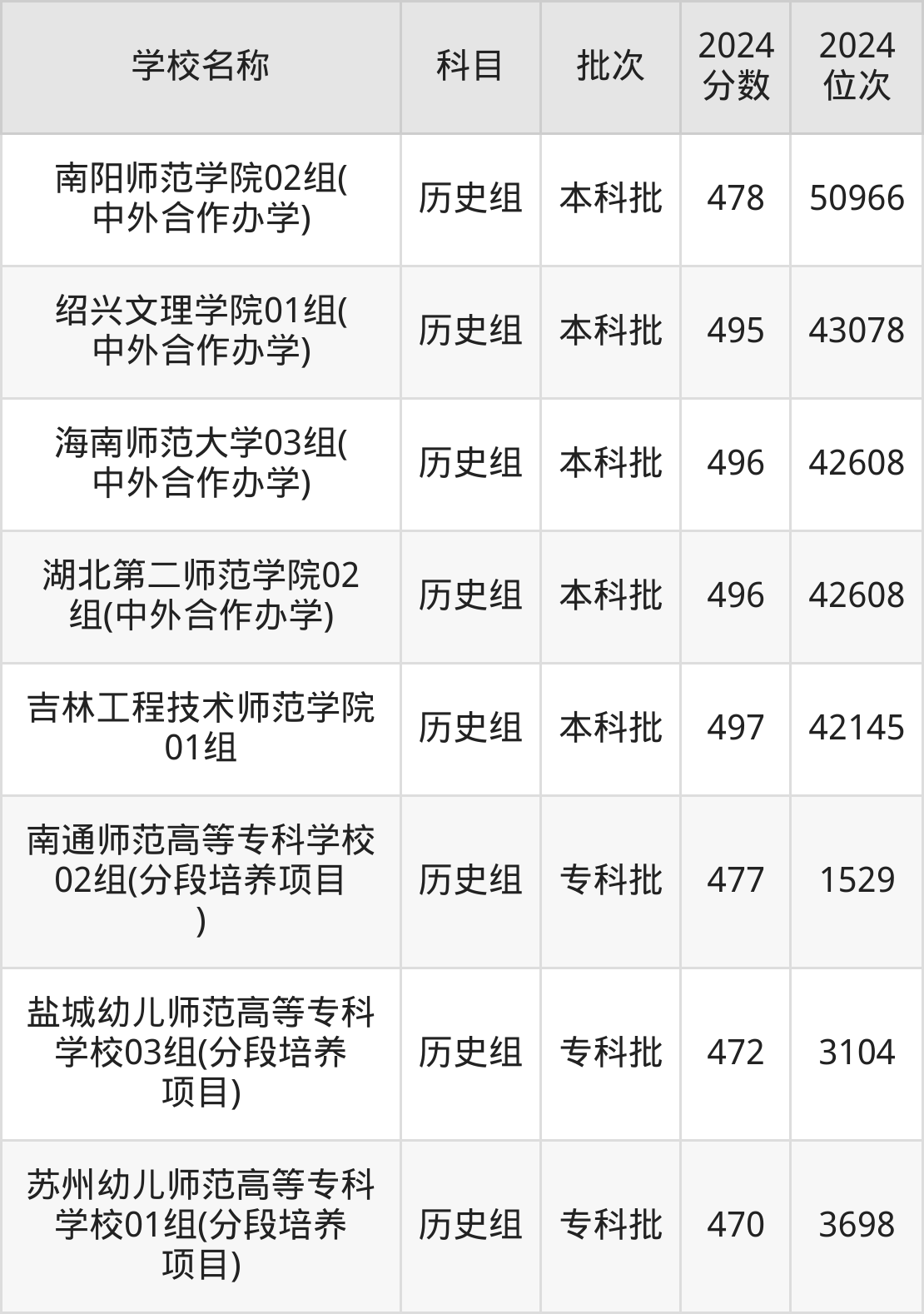 江苏高考历史组共有17所师范大学在470到500分之间录取,包含伊犁师范大学、吉林工程技术师范学院、湖北第二师范学院、海南师范大学、绍兴文理学院、天津师范大学、渭南师范学院、绍兴文理学院元培学院、咸阳师范学院、昆明文理学院。