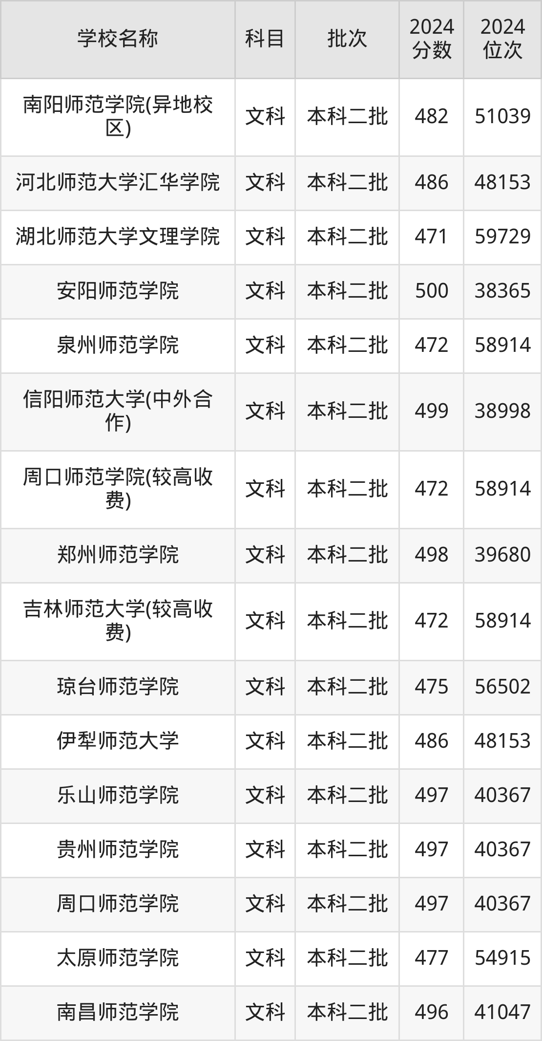 河南高考文科共有64所师范大学在470到500分之间录取,包含重庆第二师范学院、安阳师范学院、信阳师范大学(中外合作)、郑州师范学院、乐山师范学院、贵州师范学院、周口师范学院、南昌师范学院、岭南师范学院、江西科技师范大学。