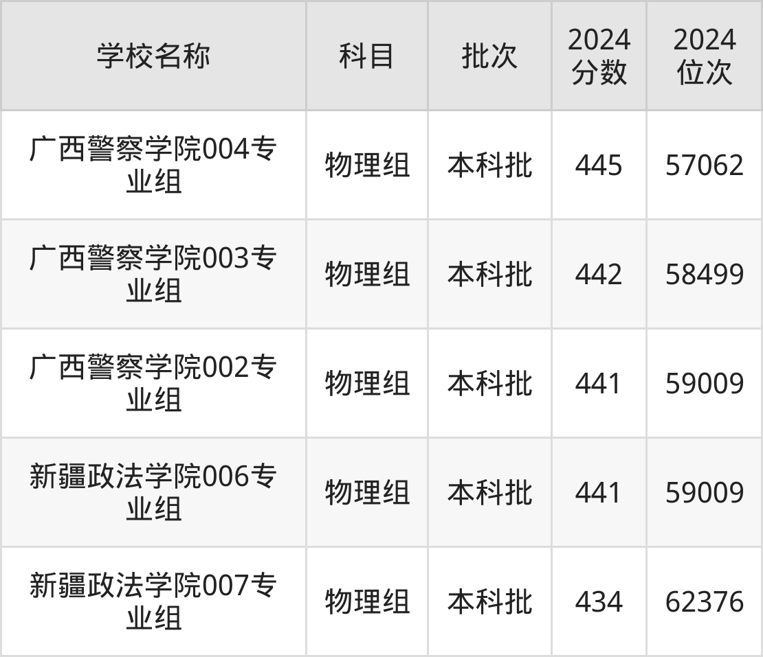 江西高考物理组共有2所二本政法大学在400到450分之间录取,包含广西警察学院、江西警察学院。