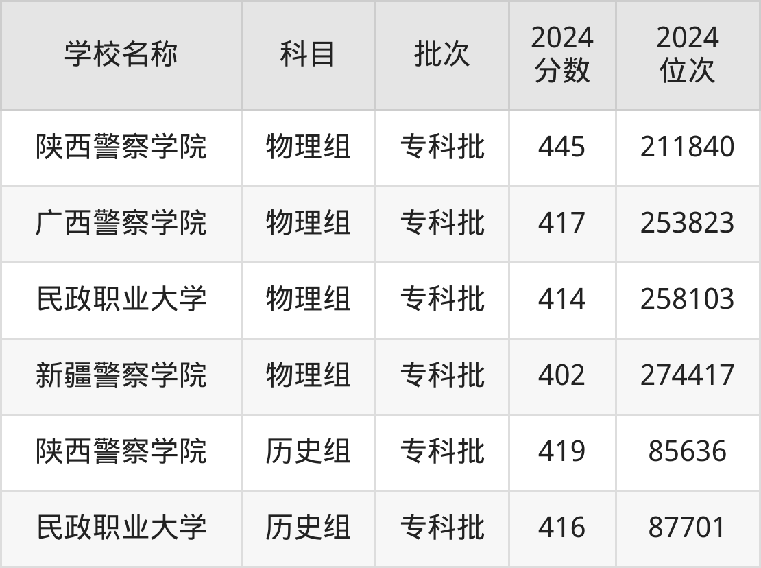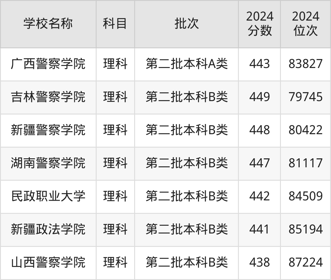 河北高考物理组共有4所二本政法大学在400到450分之间录取,包含陕西警察学院、广西警察学院、民政职业大学、新疆警察学院。