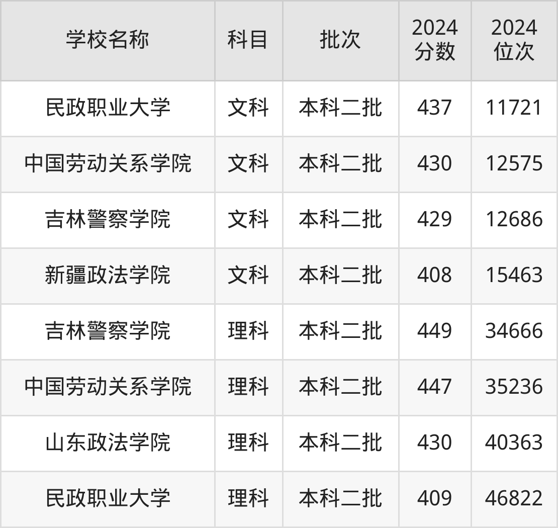 内蒙古高考文科共有4所二本政法大学在400到450分之间录取,包含民政职业大学、中国劳动关系学院、吉林警察学院、新疆政法学院。