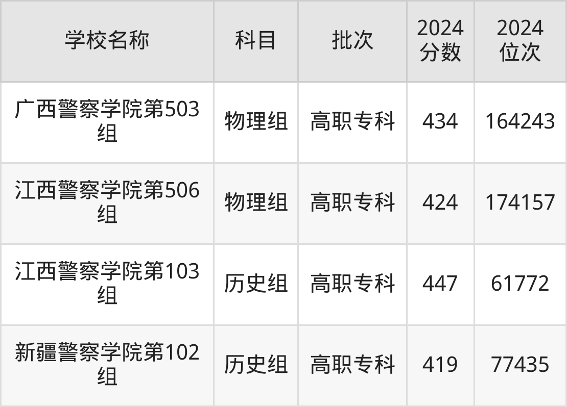 江西高考历史组共有2所二本政法大学在400到450分之间录取,包含江西警察学院、新疆警察学院。