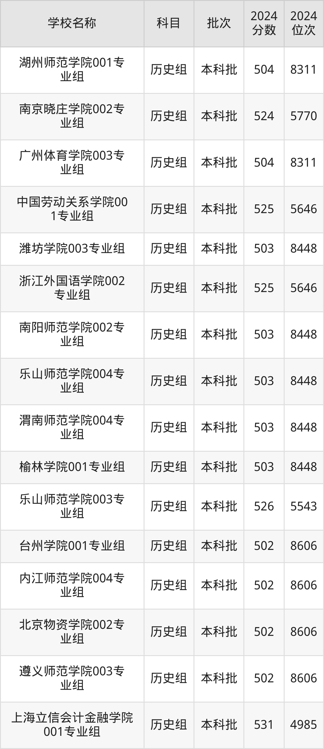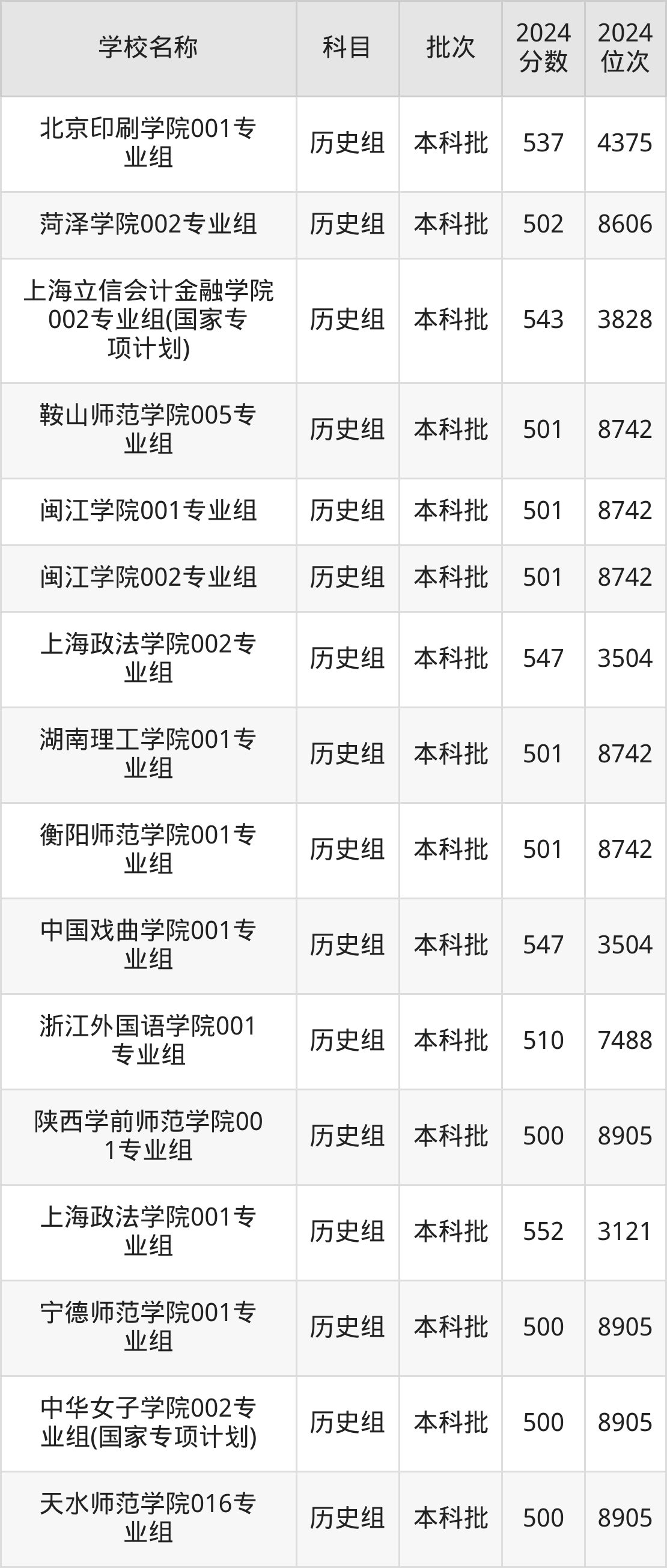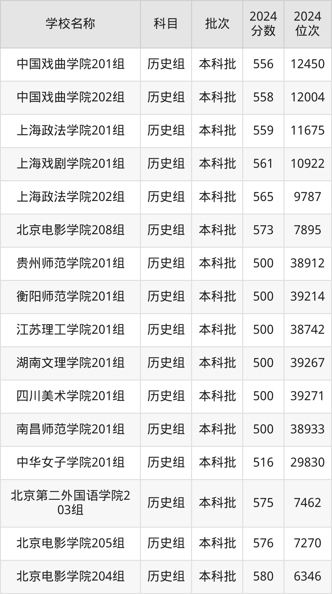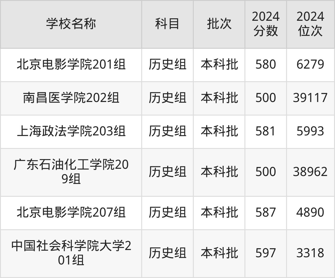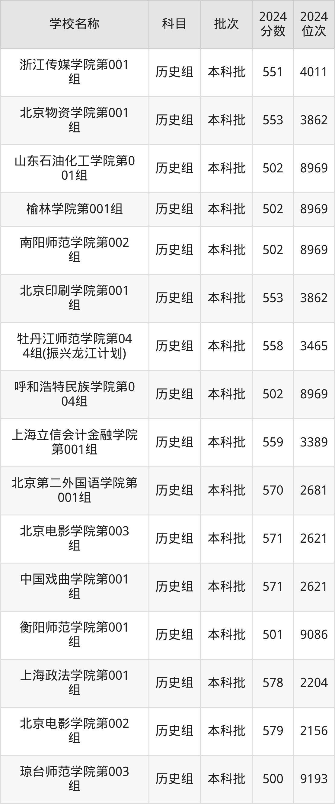 黑龙江高考历史组共有59所二本公办大学在500到600分之间录取,包含上海海关学院、北京电影学院、上海戏剧学院、上海政法学院、中国戏曲学院、北京第二外国语学院、上海立信会计金融学院、牡丹江师范学院、北京印刷学院、北京物资学院。
