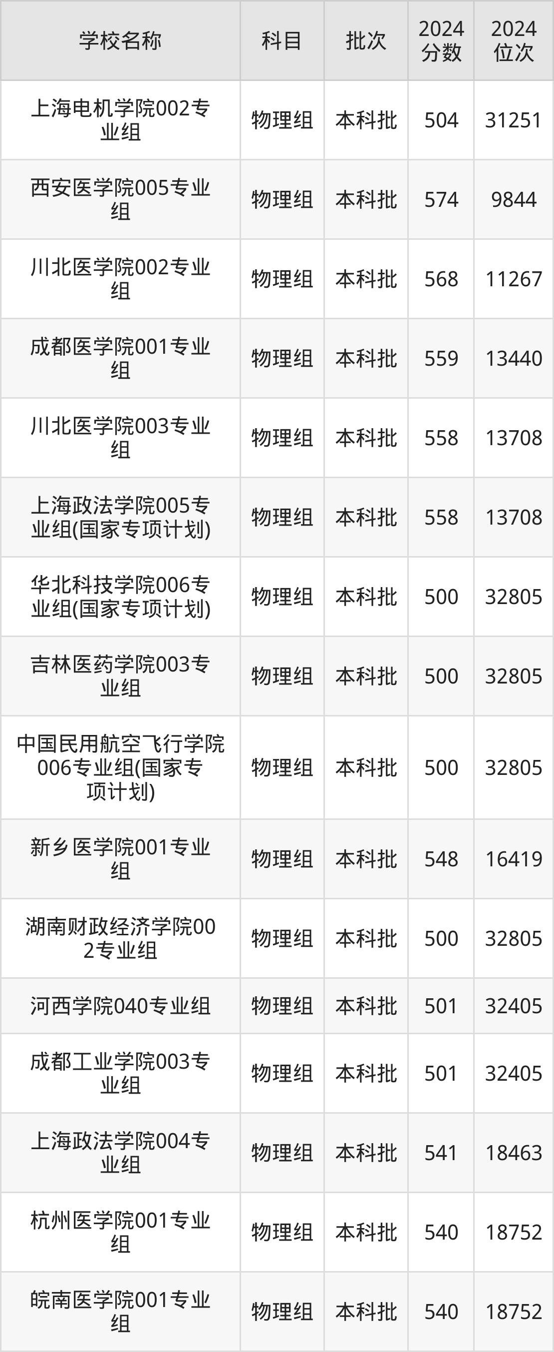 甘肃高考物理组共有36所二本公办大学在500到600分之间录取,包含西安医学院、川北医学院、成都医学院、上海政法学院、上海海关学院、新乡医学院、杭州医学院、皖南医学院、南昌医学院、桂林医学院。