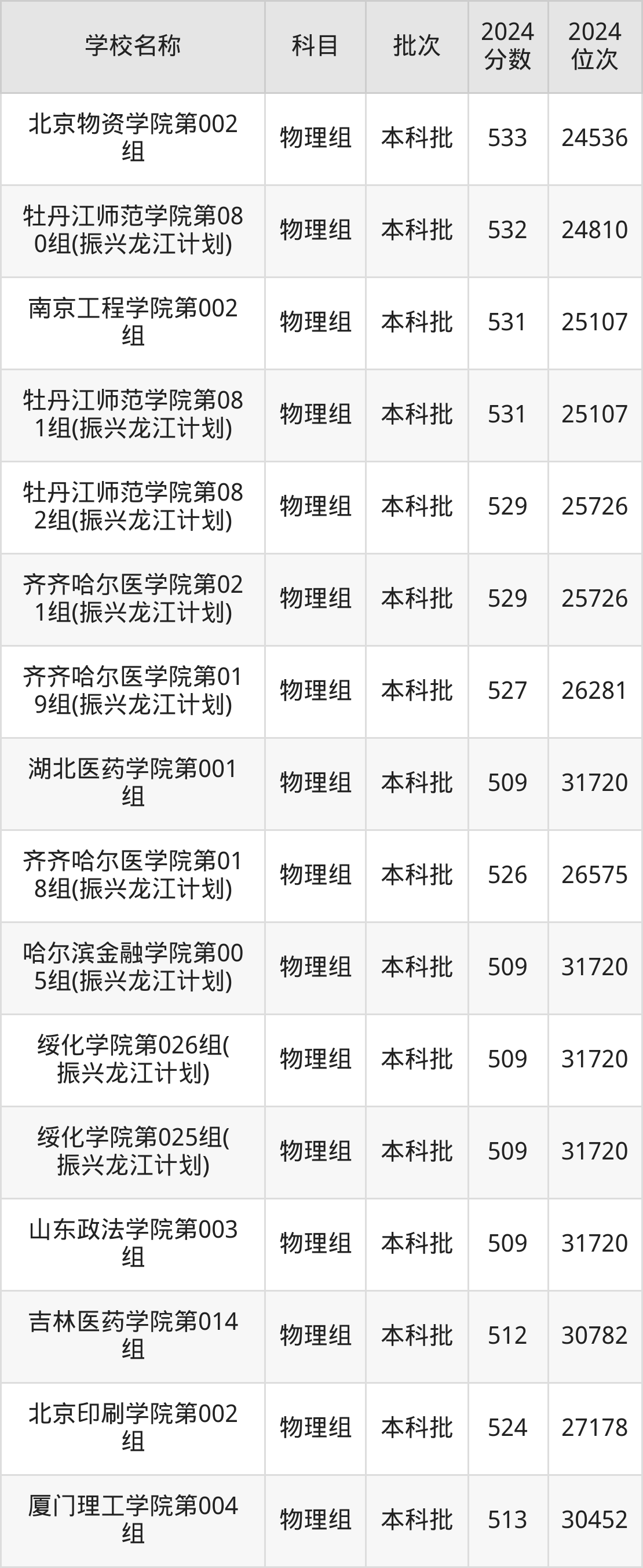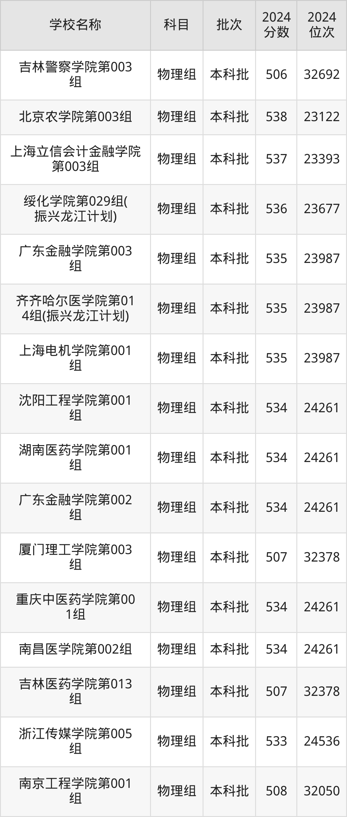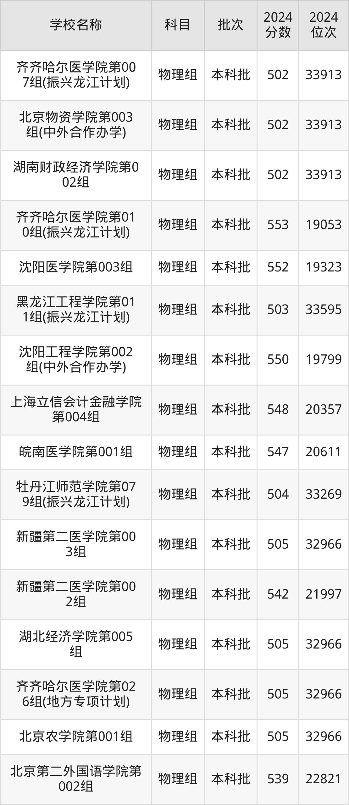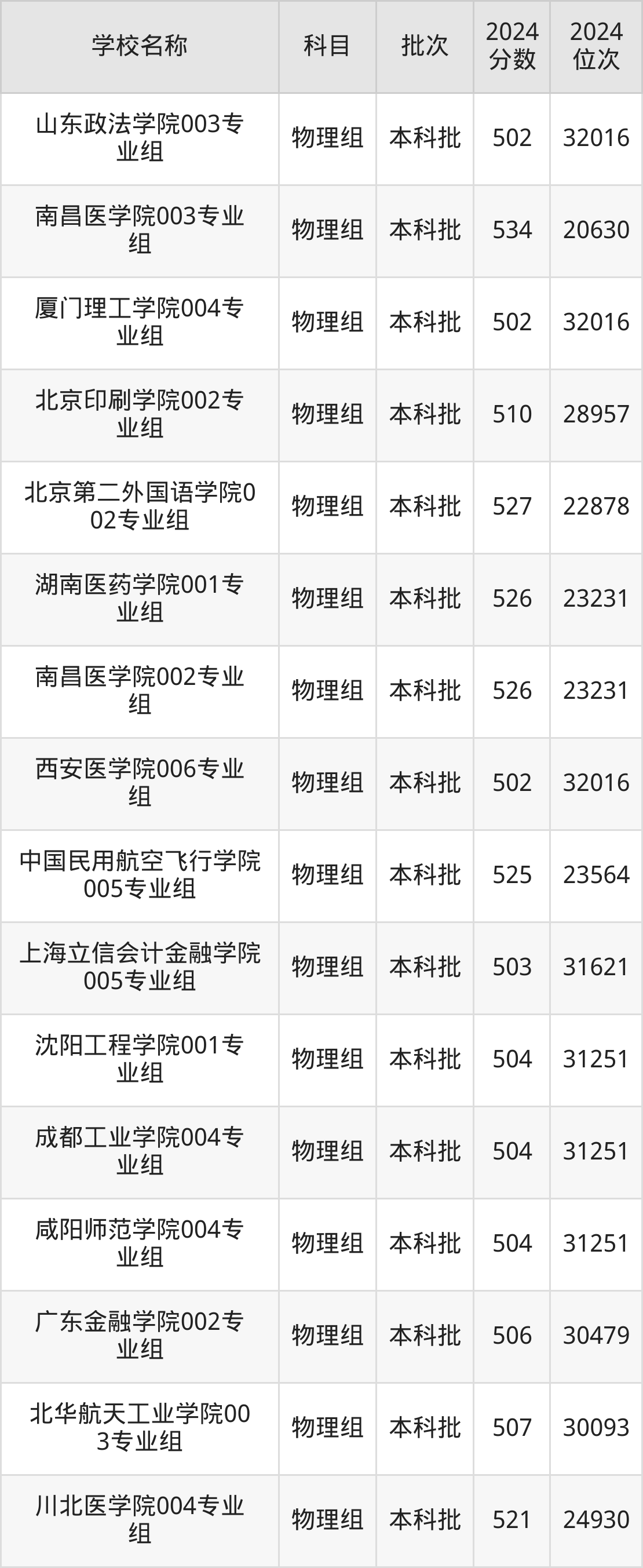 黑龙江高考物理组共有44所二本公办大学在500到600分之间录取,包含西安医学院、川北医学院、北京电影学院、南昌医学院、上海海关学院、上海政法学院、湖州师范学院、齐齐哈尔医学院、沈阳医学院、沈阳工程学院。