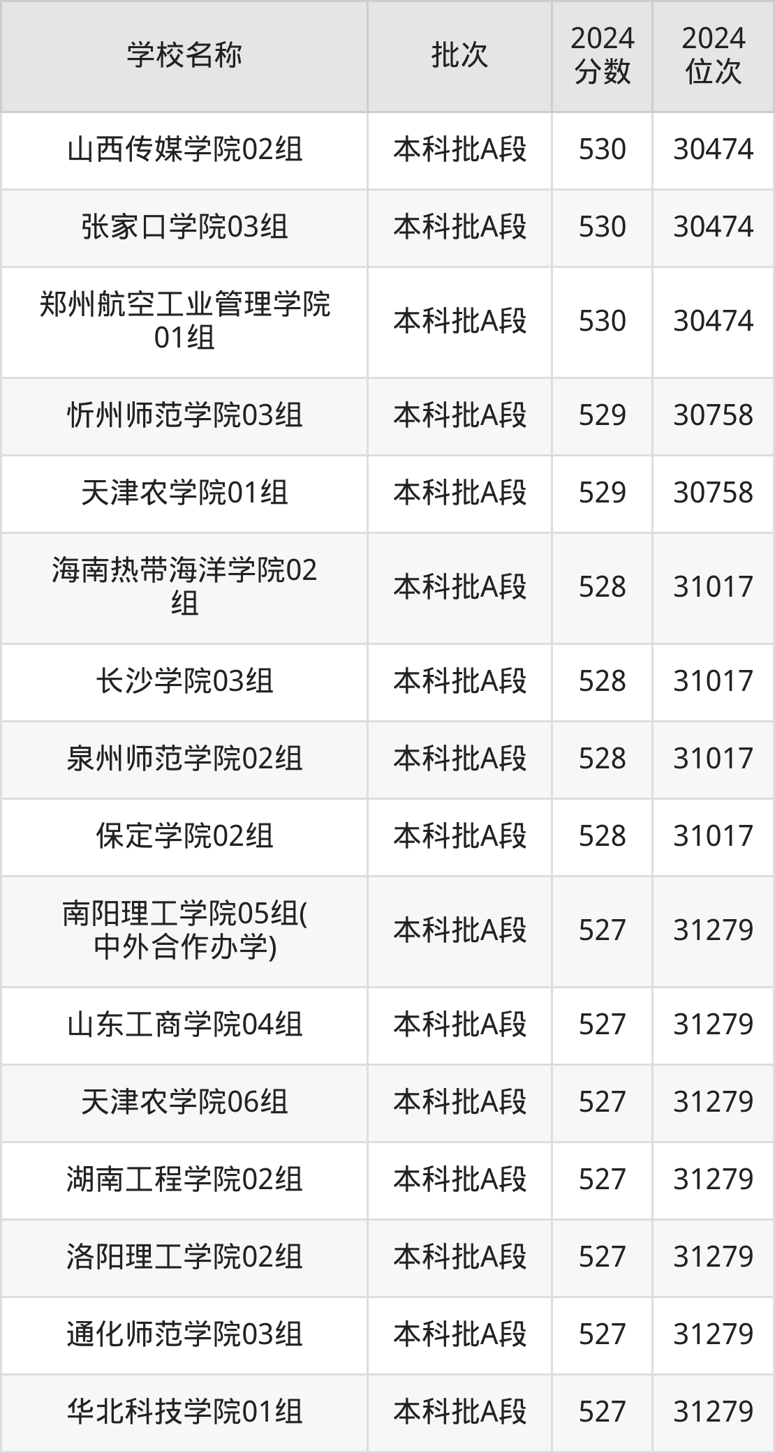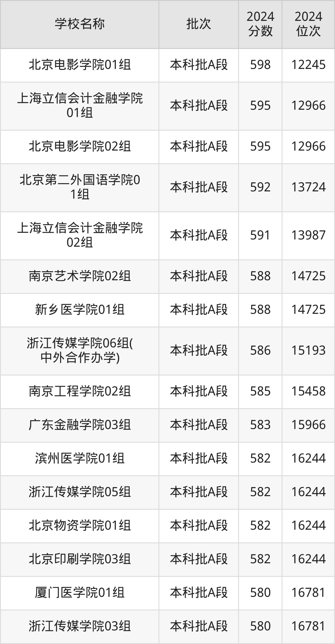 天津高考共有177所二本公办大学在500到600分之间录取,包含北京电影学院、上海立信会计金融学院、北京第二外国语学院、南京艺术学院、新乡医学院、浙江传媒学院、南京工程学院、广东金融学院、滨州医学院、北京物资学院。