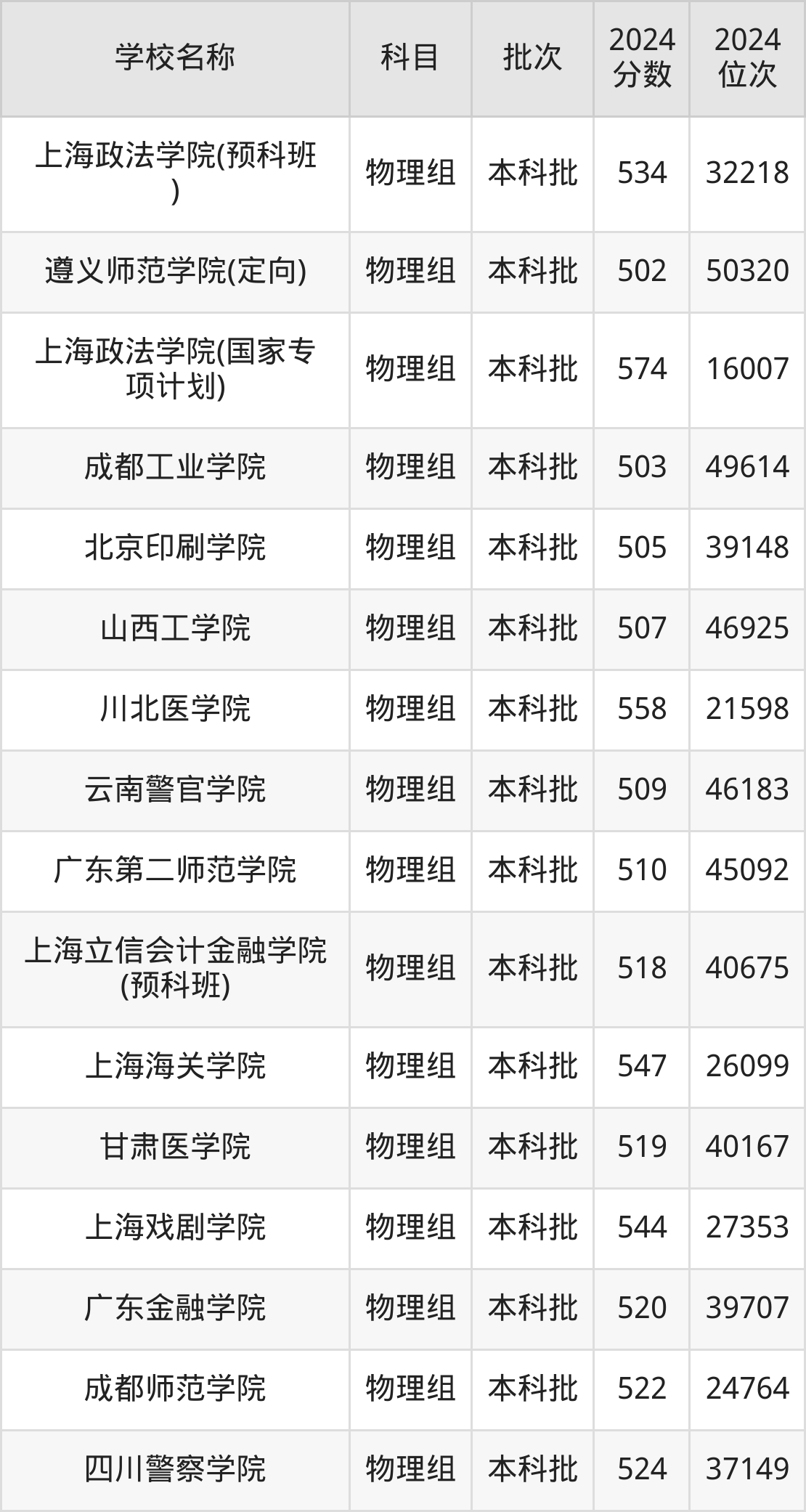 贵州高考物理组共有20所二本公办大学在500到600分之间录取,包含上海政法学院(国家专项计划)、川北医学院、上海海关学院、上海戏剧学院、上海政法学院(预科班)、广东警官学院、皖南医学院、东莞理工学院、北京第二外国语学院、四川警察学院。