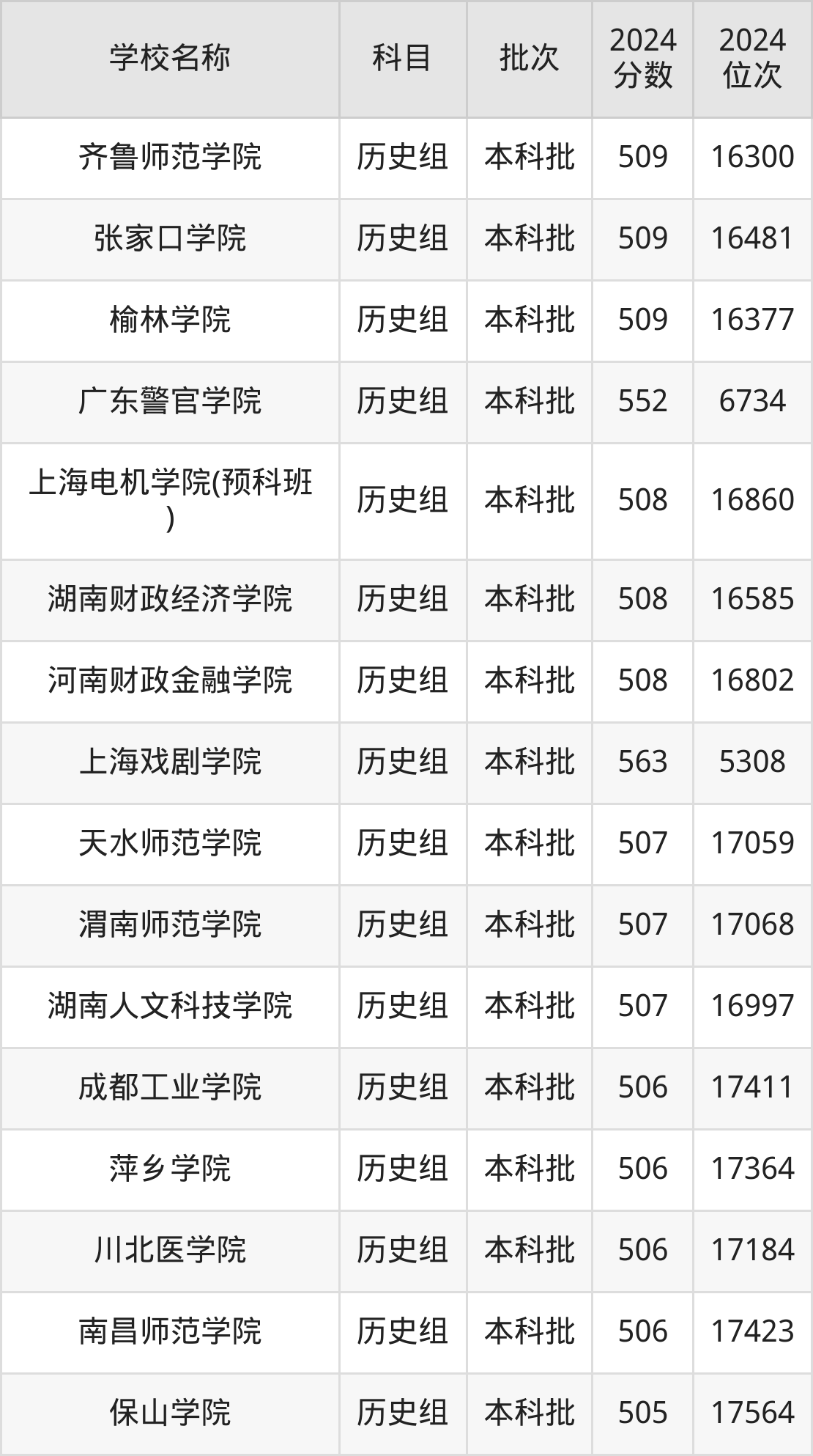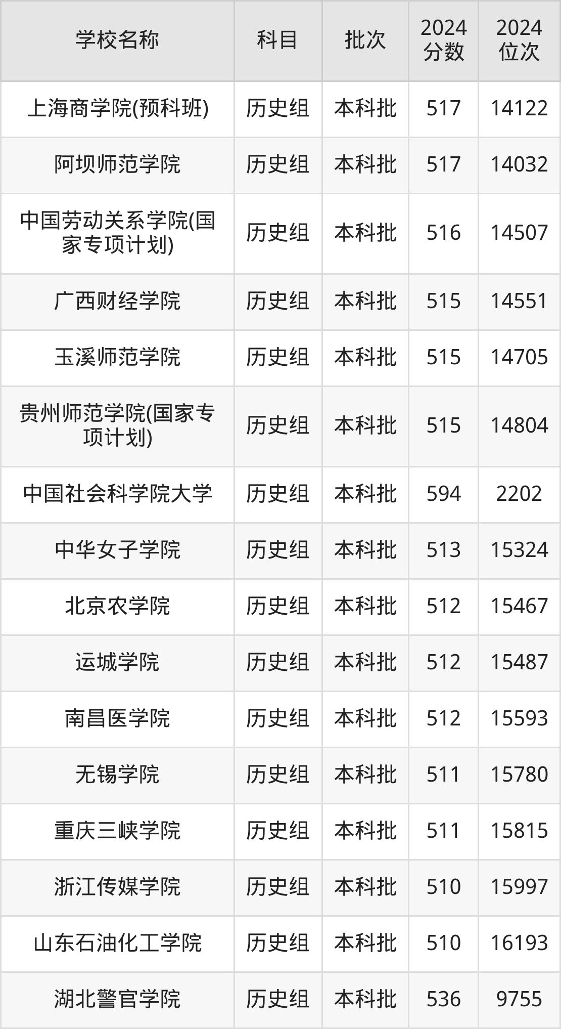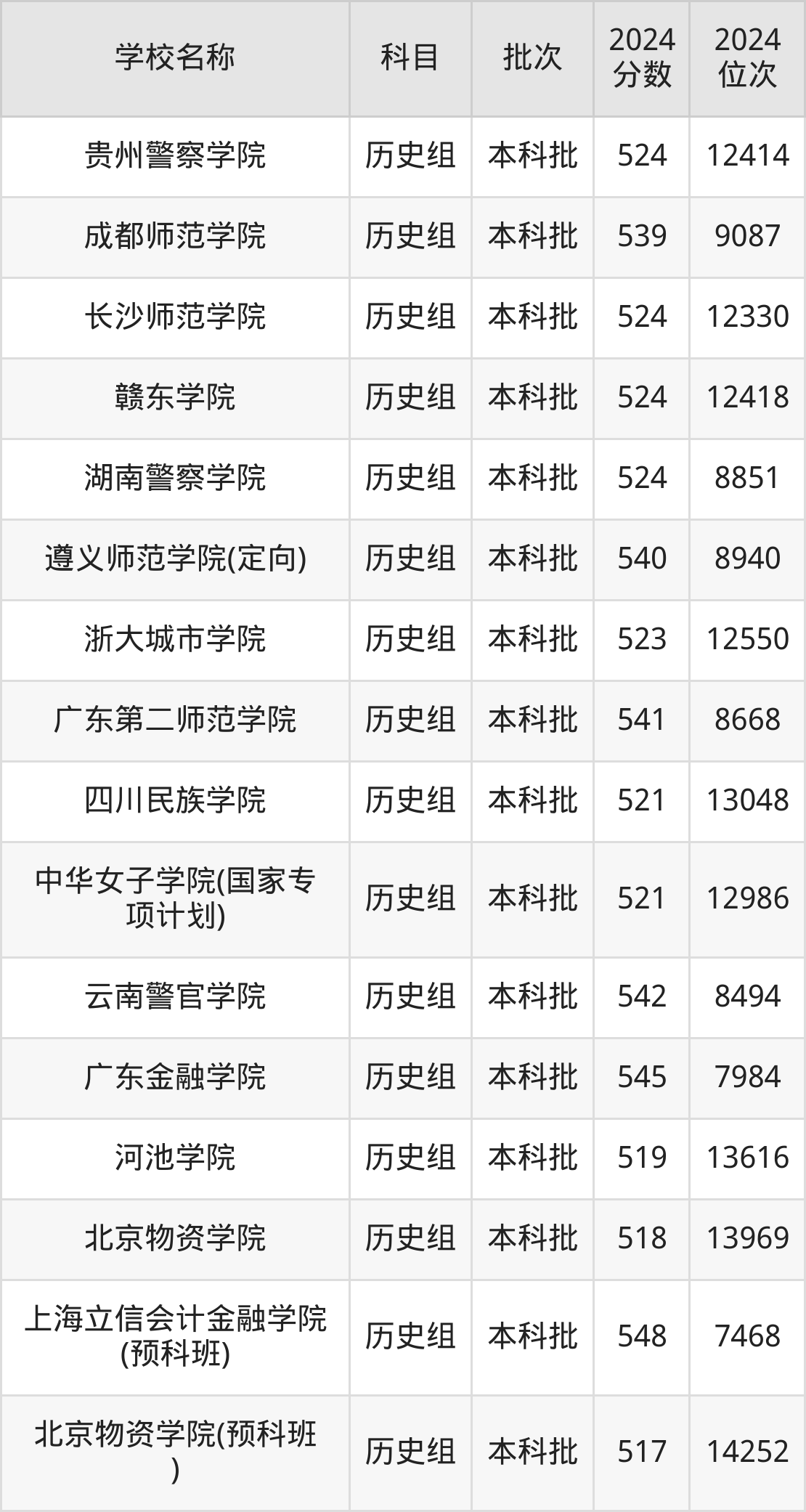 贵州高考历史组共有88所二本公办大学在500到600分之间录取,包含中国社会科学院大学、上海政法学院(国家专项计划)、上海政法学院(预科班)、中国戏曲学院、上海戏剧学院、广东警官学院、四川警察学院、上海立信会计金融学院(预科班)、广东金融学院、云南警官学院。