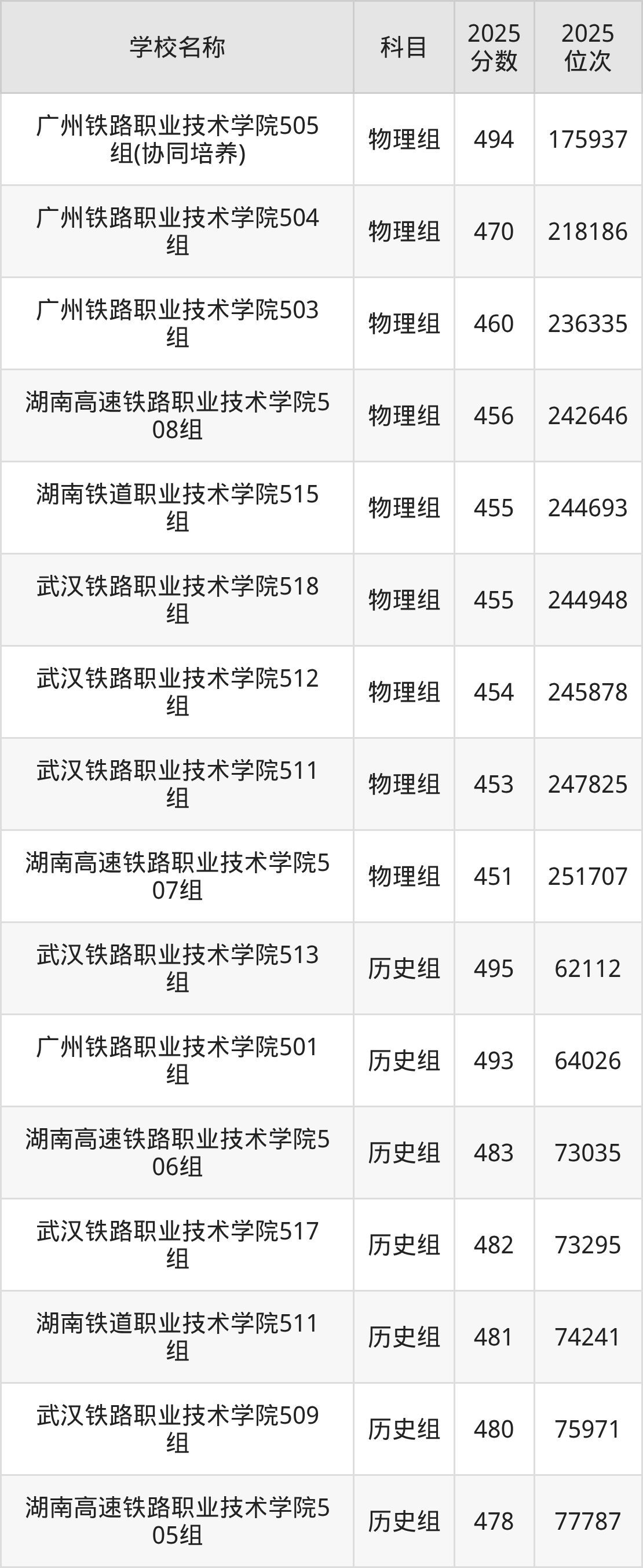 广东高考物理组共有4所铁路专科学校在450到500分之间录取,包含广州铁路职业技术学院、湖南高速铁路职业技术学院、湖南铁道职业技术学院、武汉铁路职业技术学院。