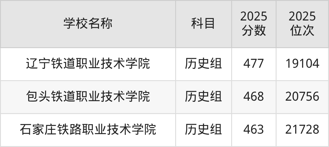 辽宁高考历史组共有3所铁路专科学校在450到500分之间录取,包含辽宁铁道职业技术学院、包头铁道职业技术学院、石家庄铁路职业技术学院。