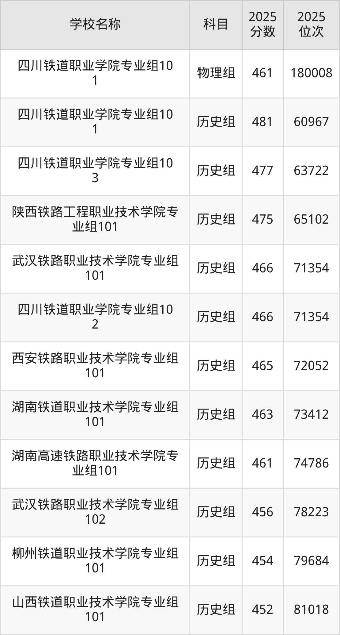 四川高考历史组共有8所铁路专科学校在450到500分之间录取,包含四川铁道职业学院、陕西铁路工程职业技术学院、武汉铁路职业技术学院、西安铁路职业技术学院、湖南铁道职业技术学院、湖南高速铁路职业技术学院、柳州铁道职业技术学院、山西铁道职业技术学院。