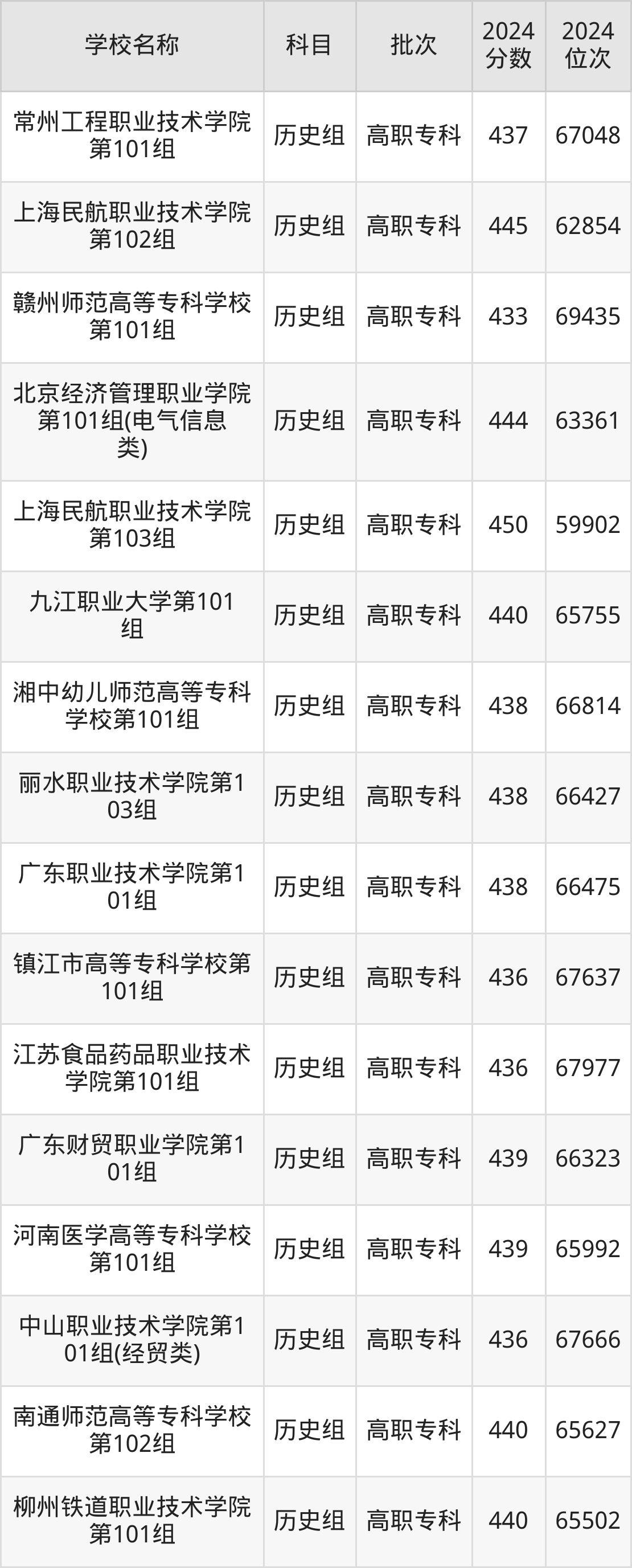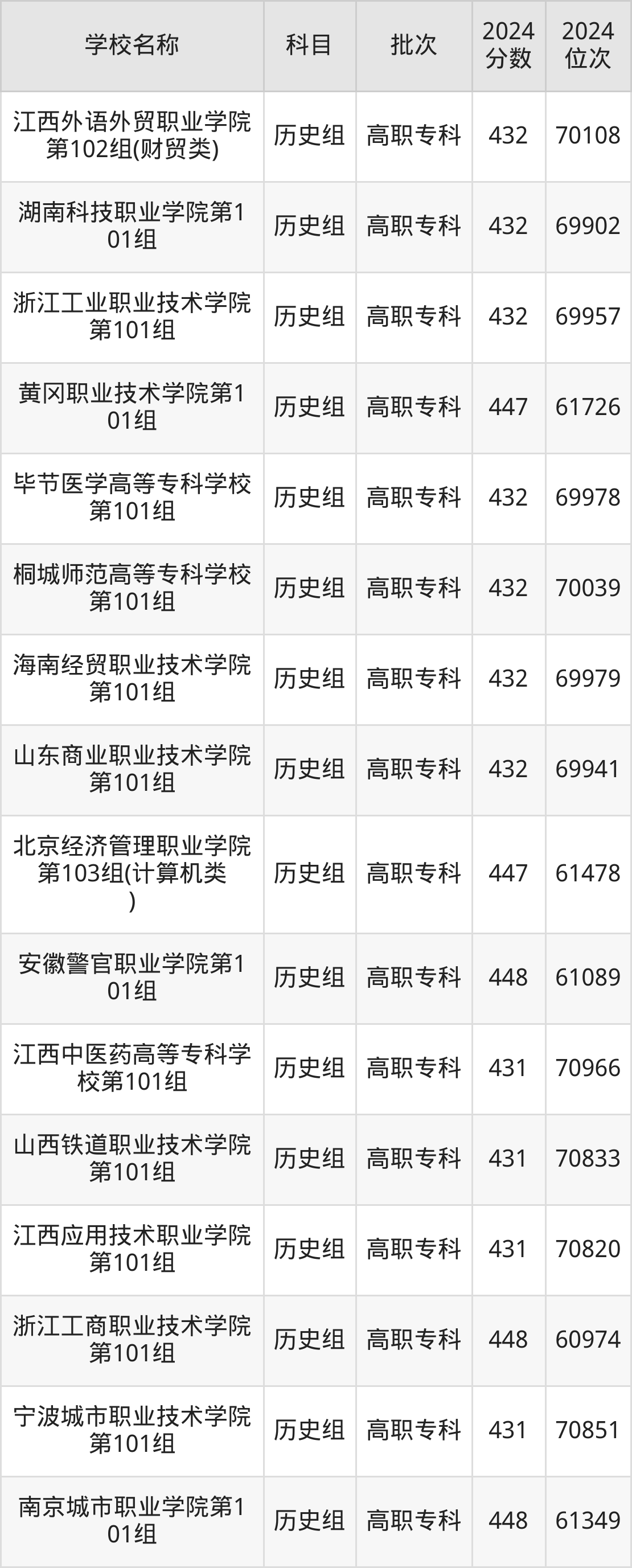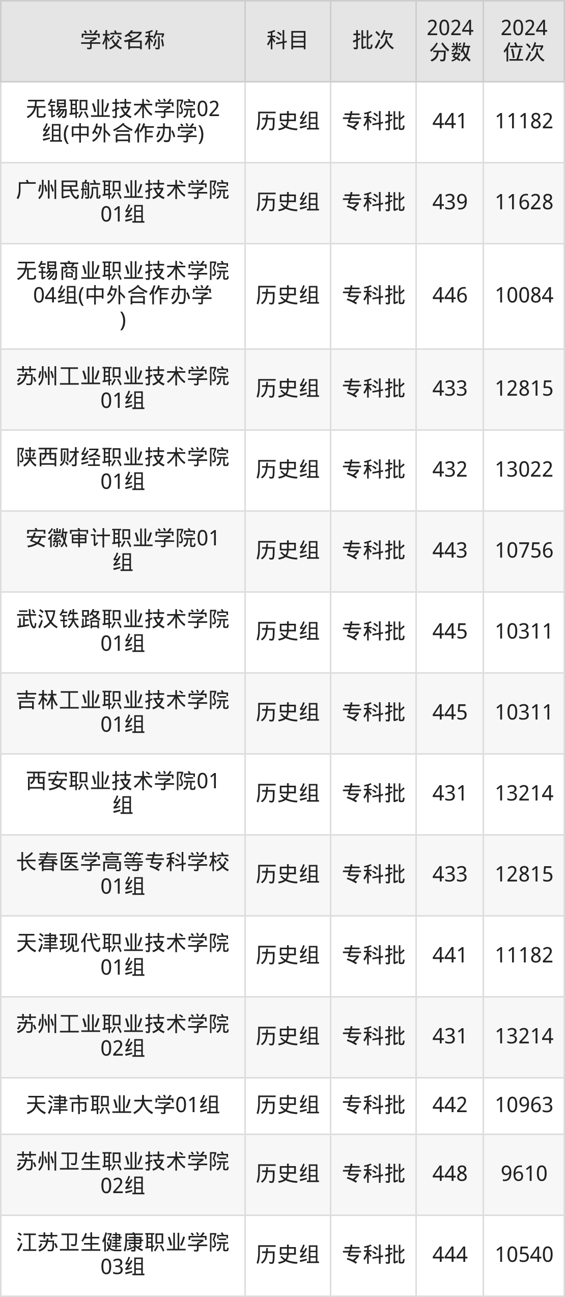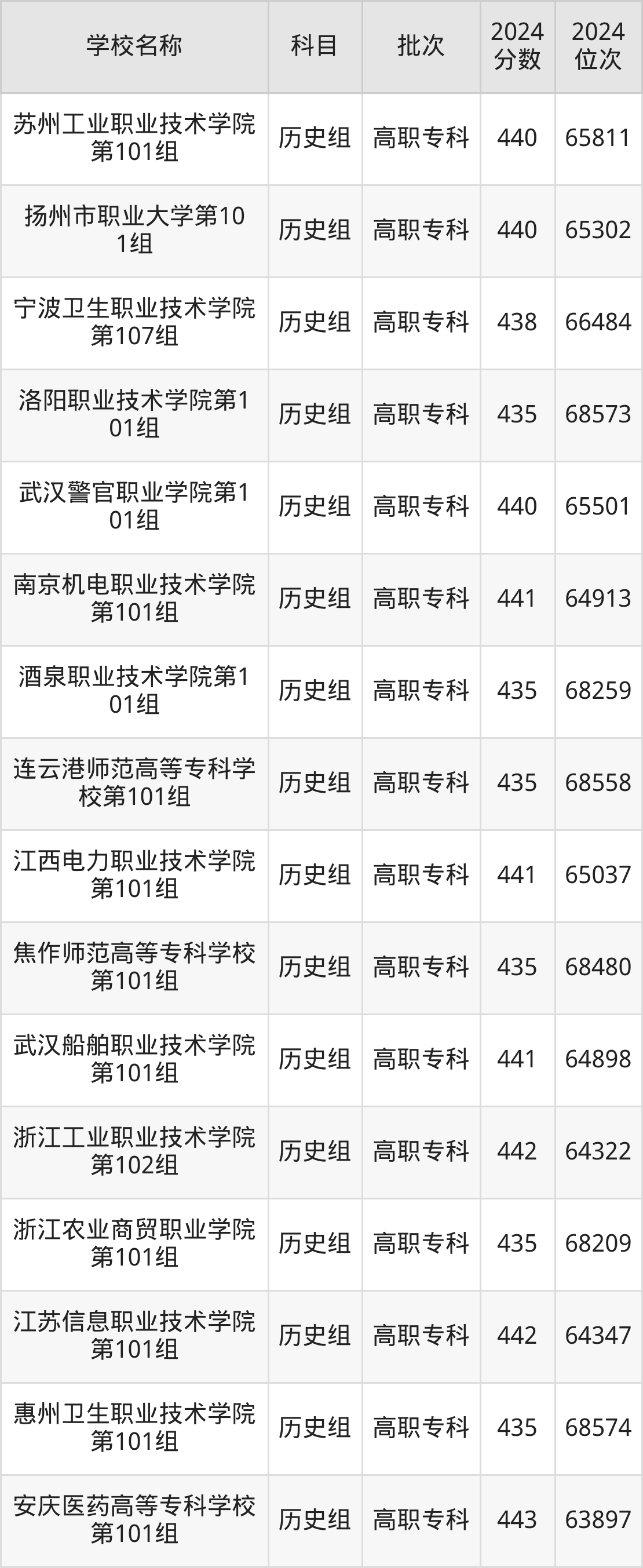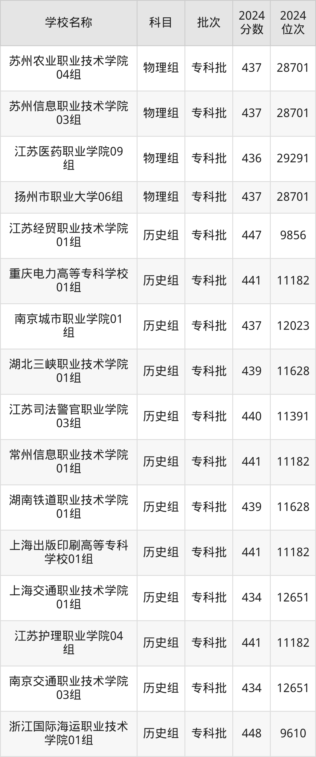 江苏高考历史组共有26所公办专科学校在430到450分之间录取,包含浙江国际海运职业技术学院、苏州卫生职业技术学院、江苏经贸职业技术学院、无锡商业职业技术学院、吉林工业职业技术学院、武汉铁路职业技术学院、江苏卫生健康职业学院、安徽审计职业学院、天津市职业大学、重庆电力高等专科学校。