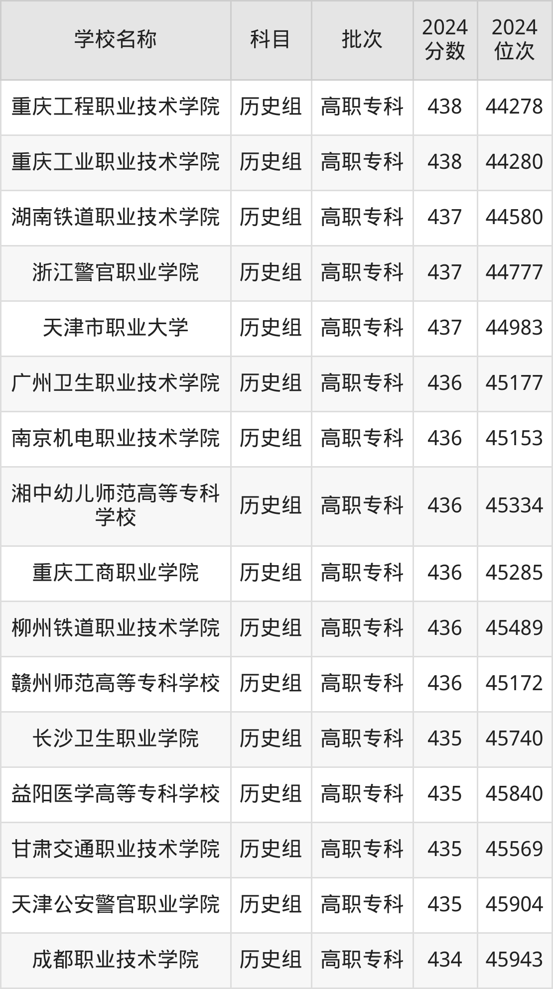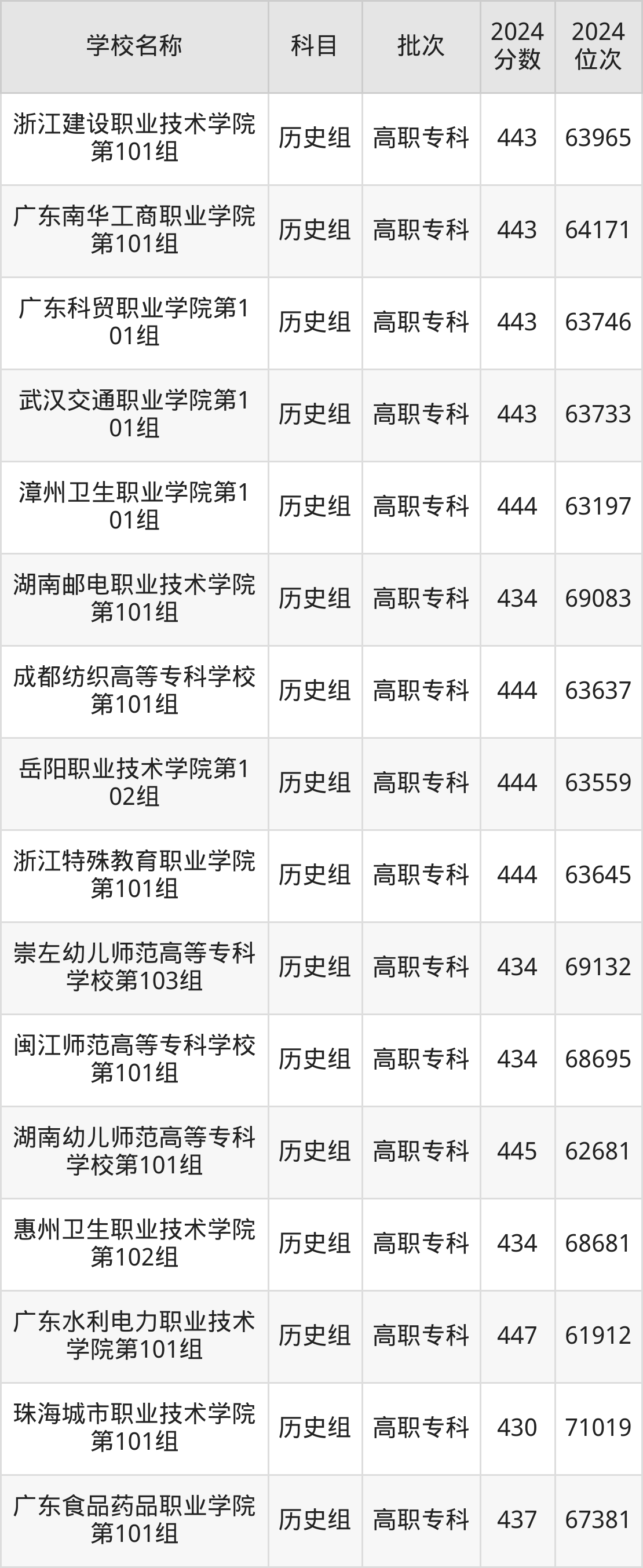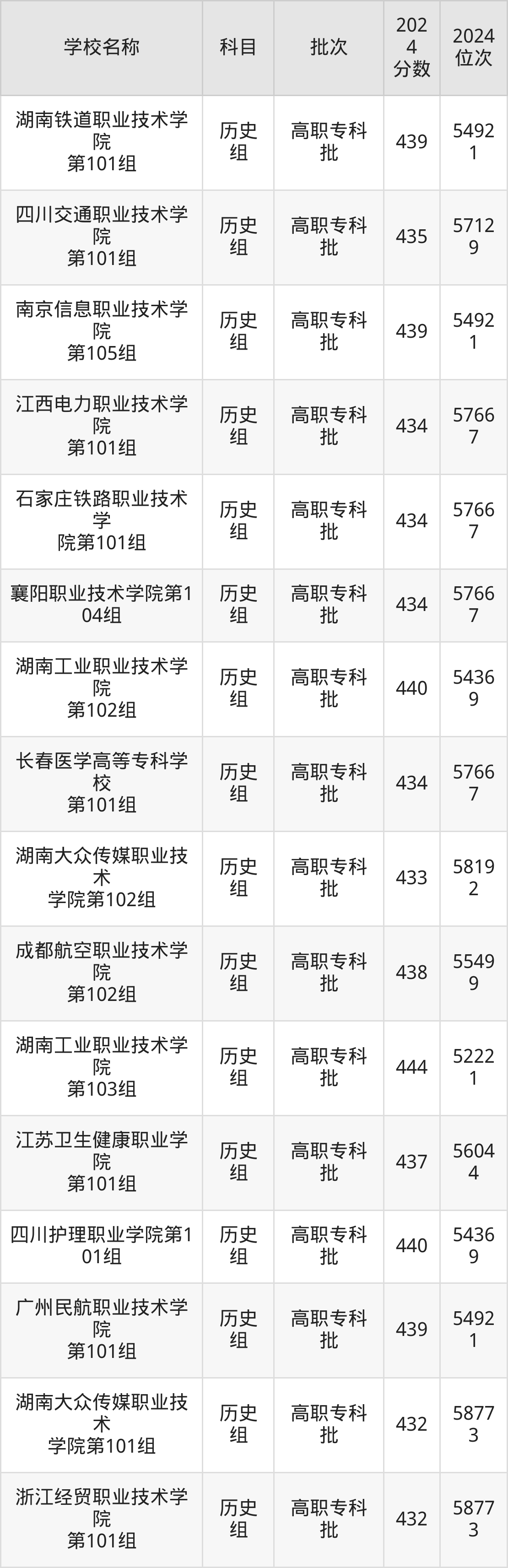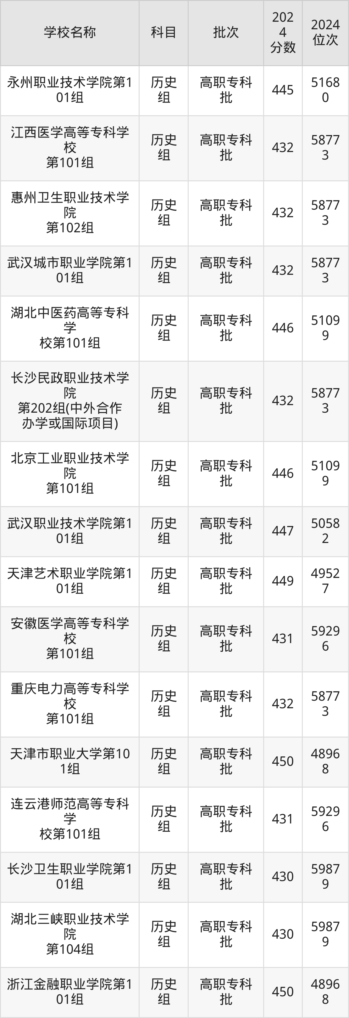 湖南高考历史组共有37所公办专科学校在430到450分之间录取,包含浙江金融职业学院、天津市职业大学、天津艺术职业学院、武汉职业技术学院、北京工业职业技术学院、湖北中医药高等专科学校、永州职业技术学院、重庆城市管理职业学院、湖南工业职业技术学院、广州卫生职业技术学院。