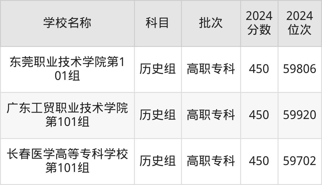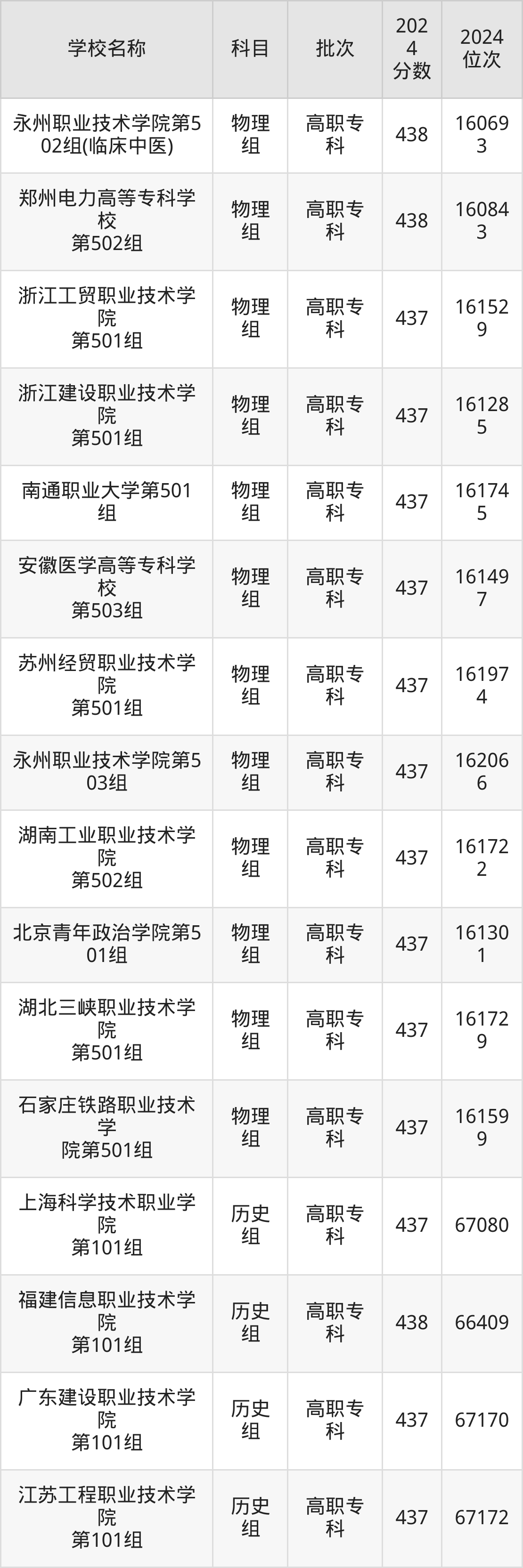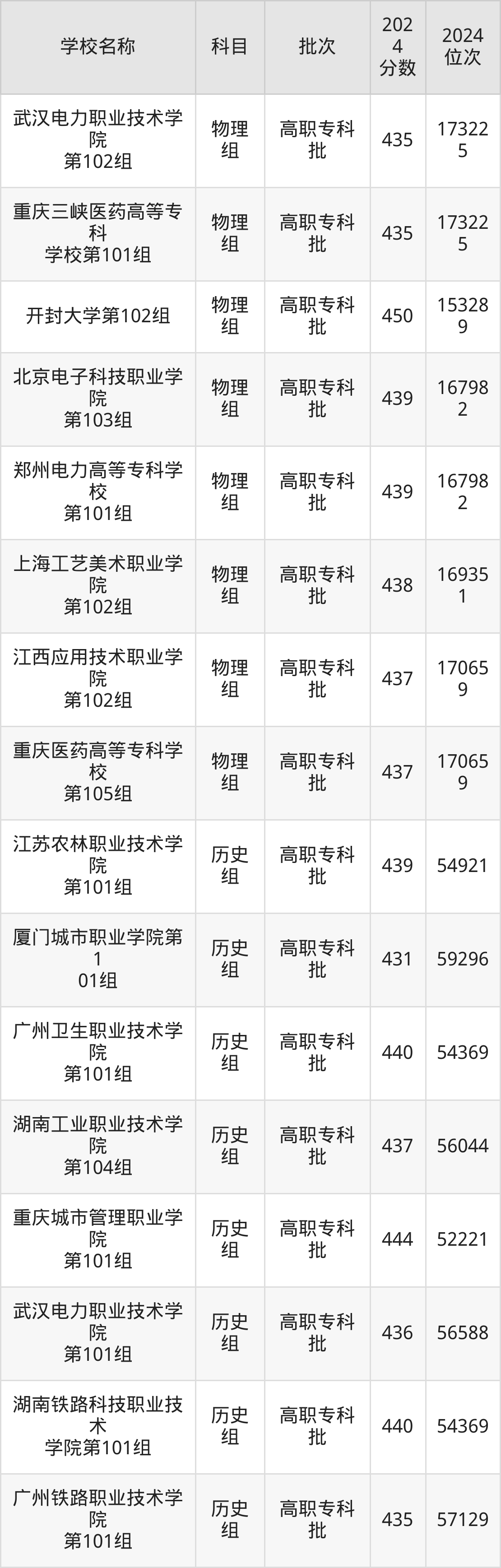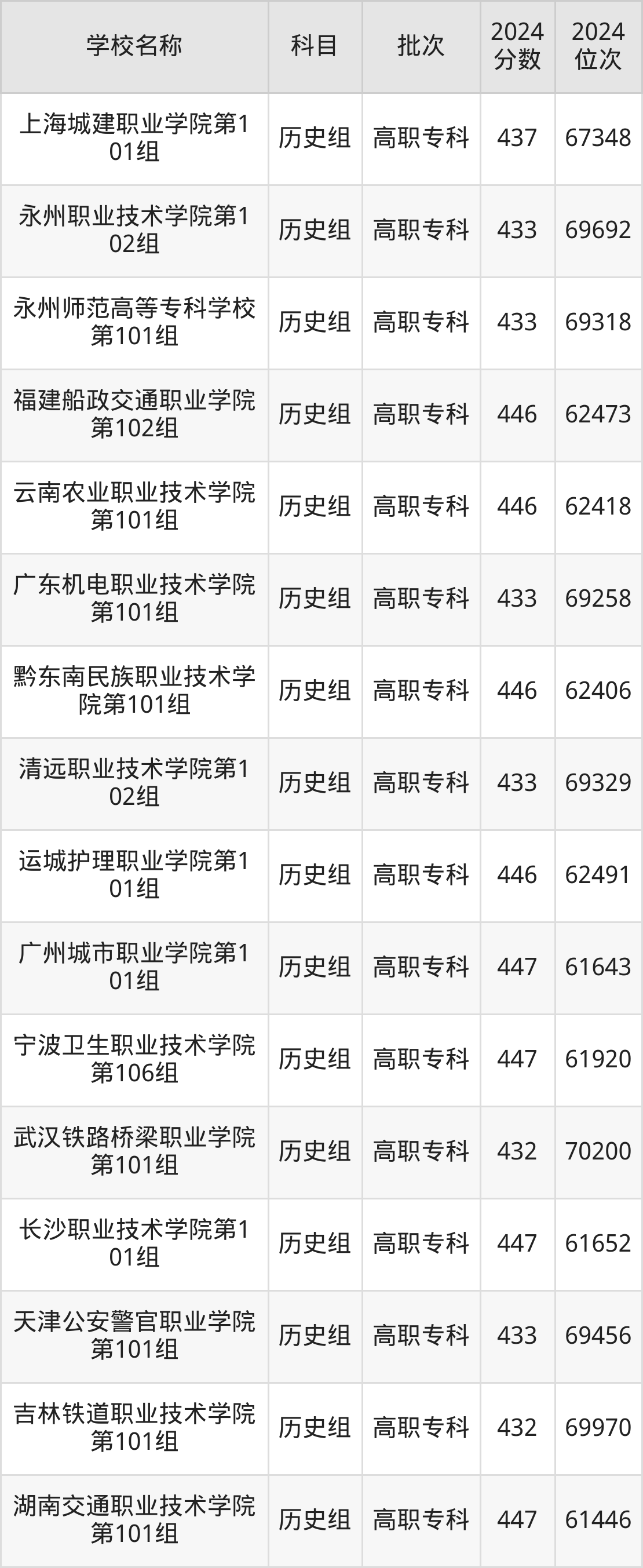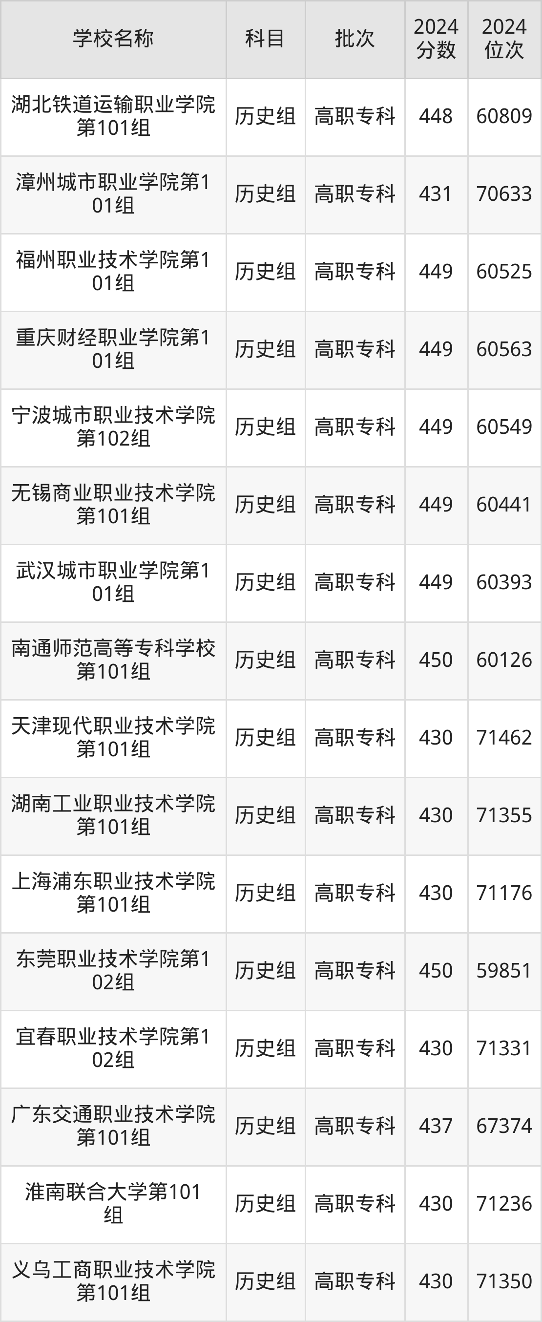 湖南高考历史组共有37所公办专科学校在430到450分之间录取,包含浙江金融职业学院、天津市职业大学、天津艺术职业学院、武汉职业技术学院、北京工业职业技术学院、湖北中医药高等专科学校、永州职业技术学院、重庆城市管理职业学院、湖南工业职业技术学院、广州卫生职业技术学院。