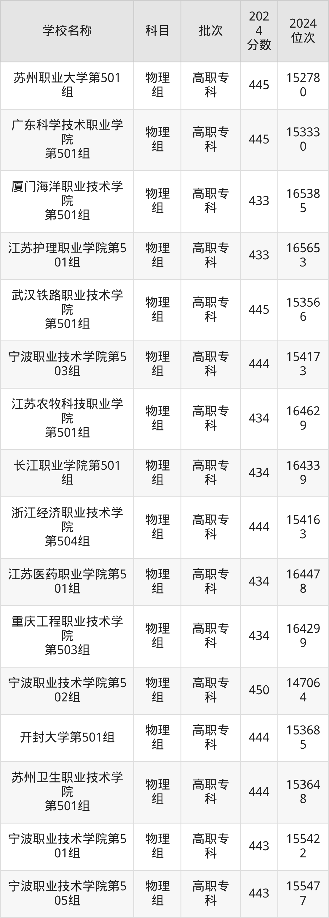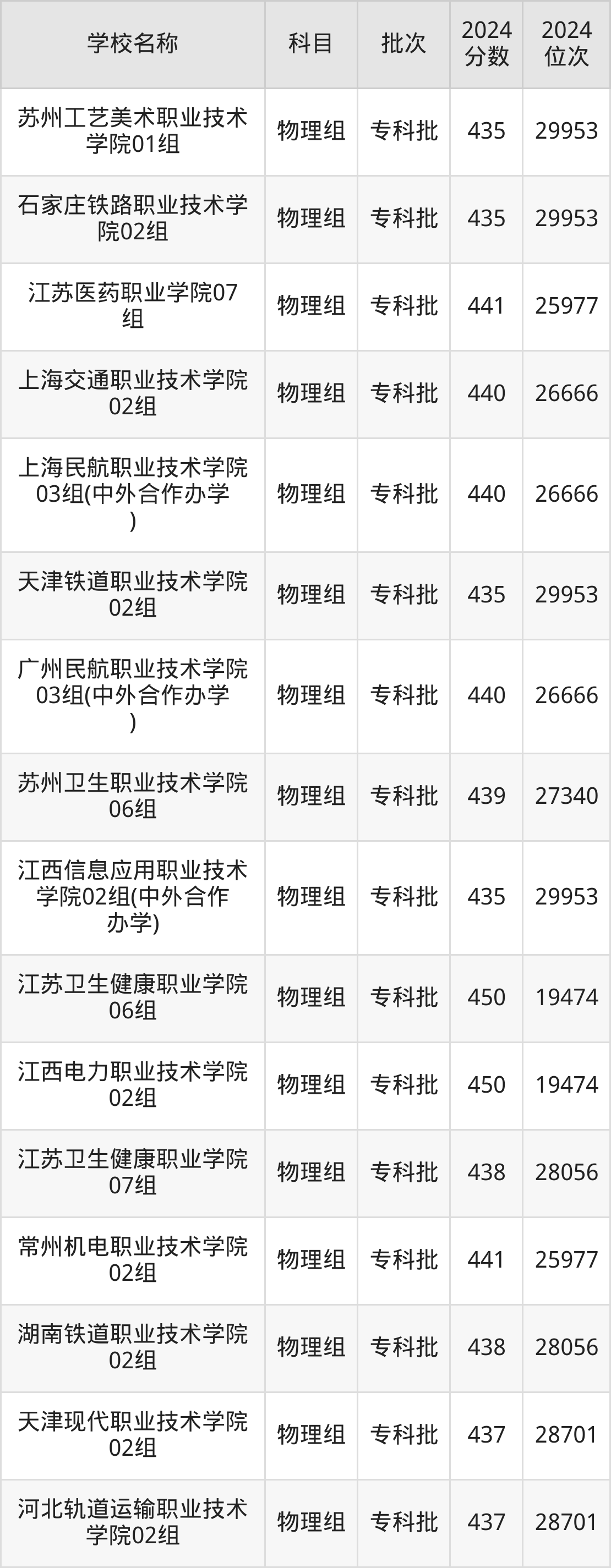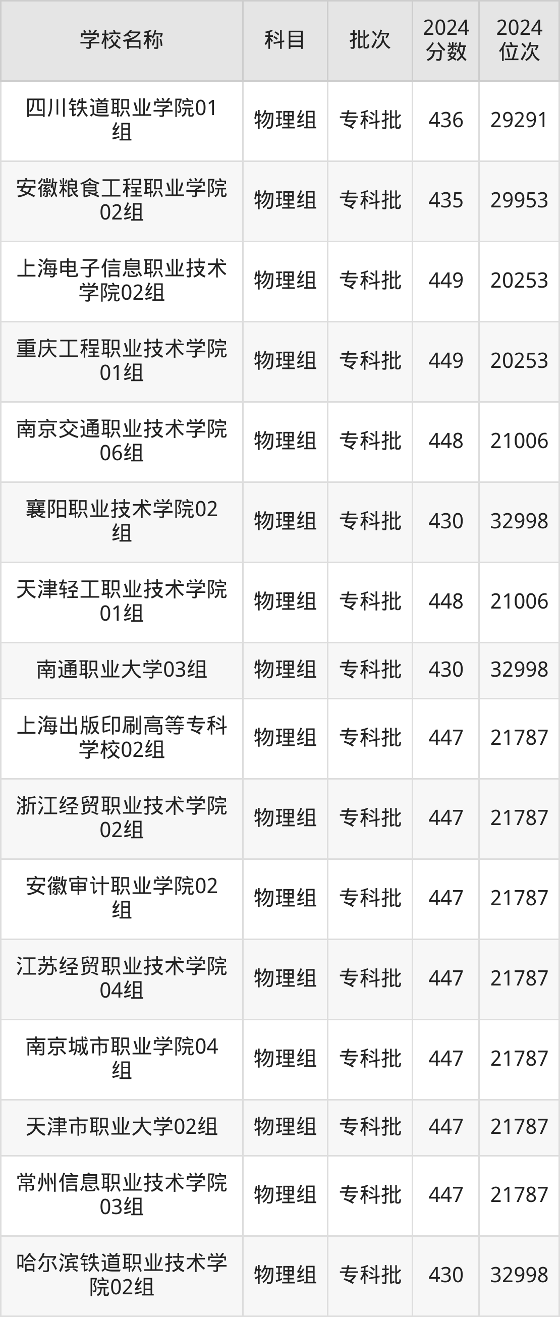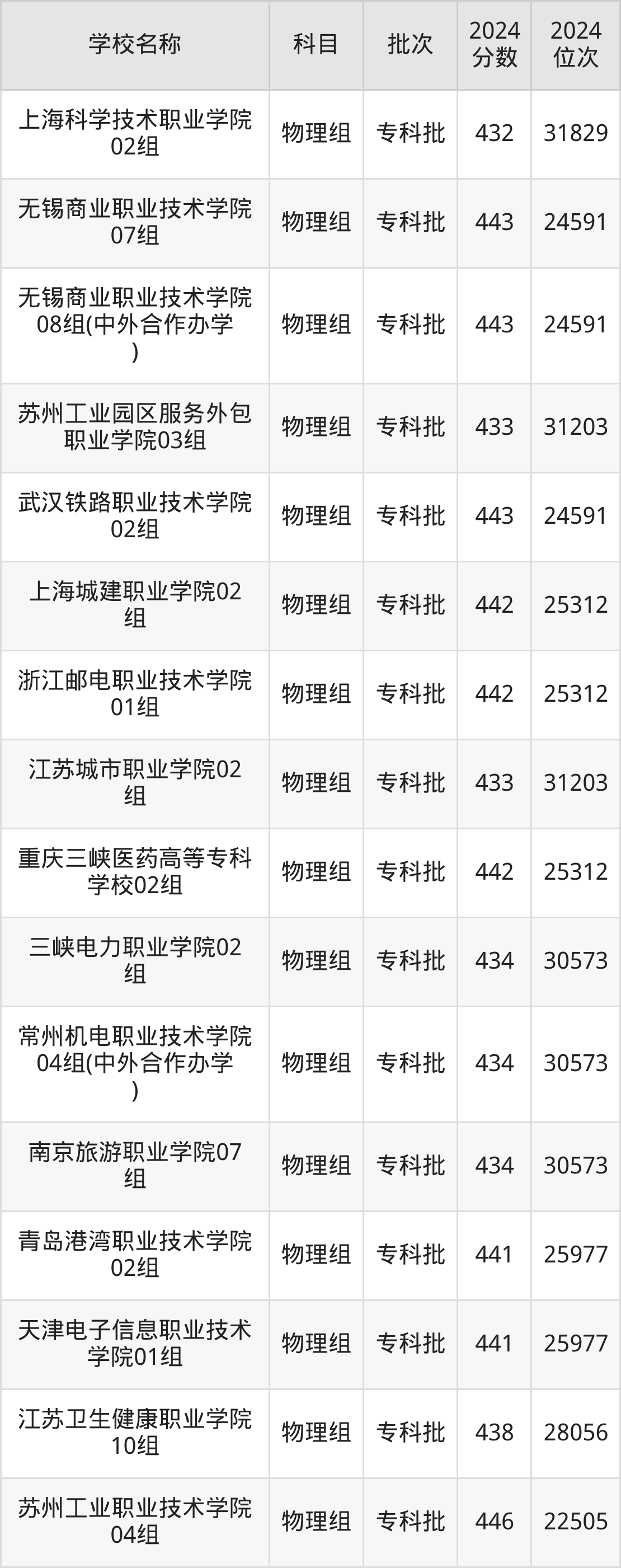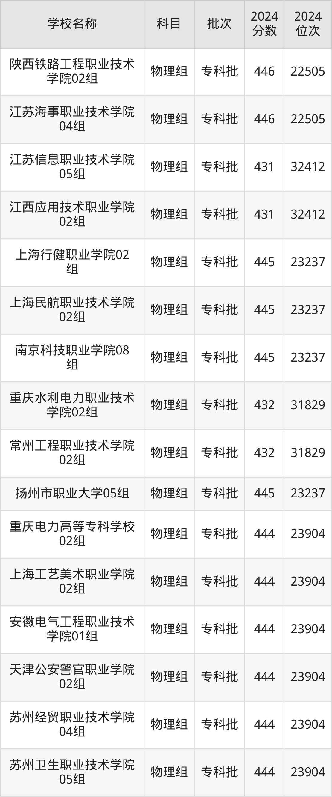 江苏高考物理组共有60所公办专科学校在430到450分之间录取,包含江西电力职业技术学院、江苏卫生健康职业学院、上海电子信息职业技术学院、重庆工程职业技术学院、南京交通职业技术学院、天津轻工职业技术学院、上海出版印刷高等专科学校、浙江经贸职业技术学院、安徽审计职业学院、江苏经贸职业技术学院。