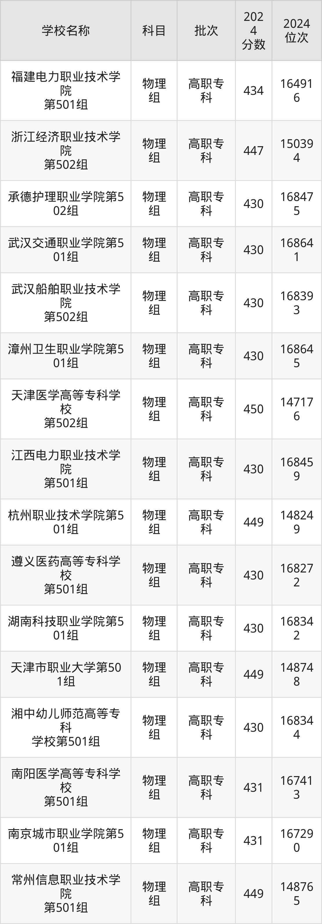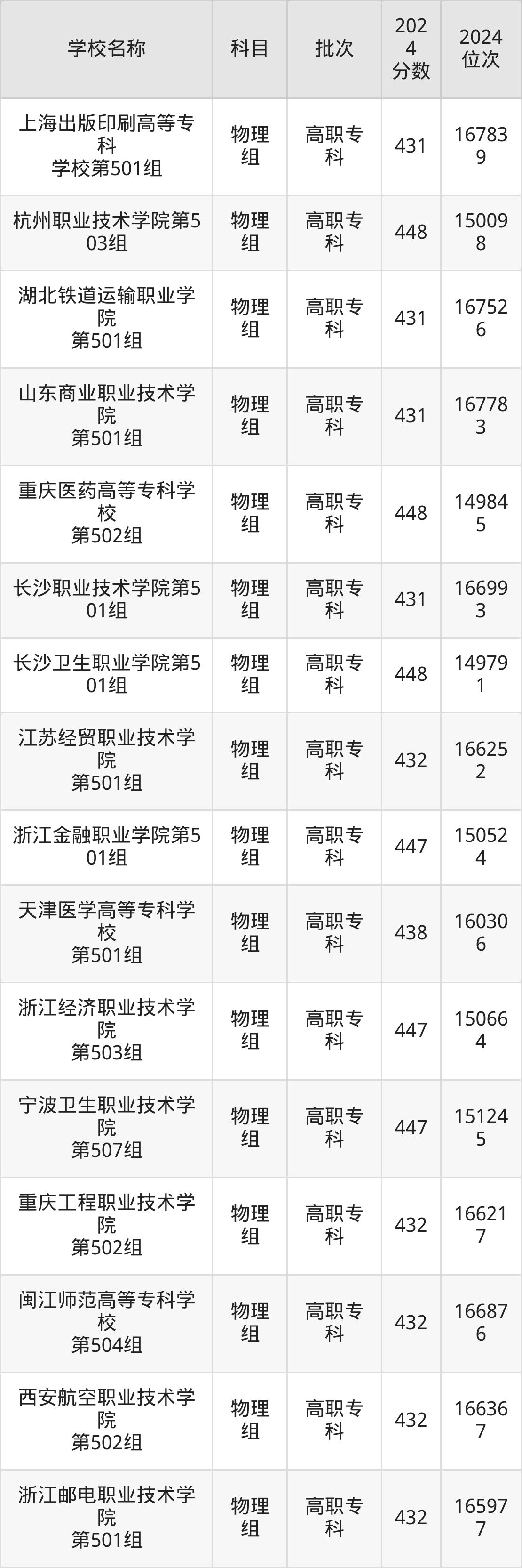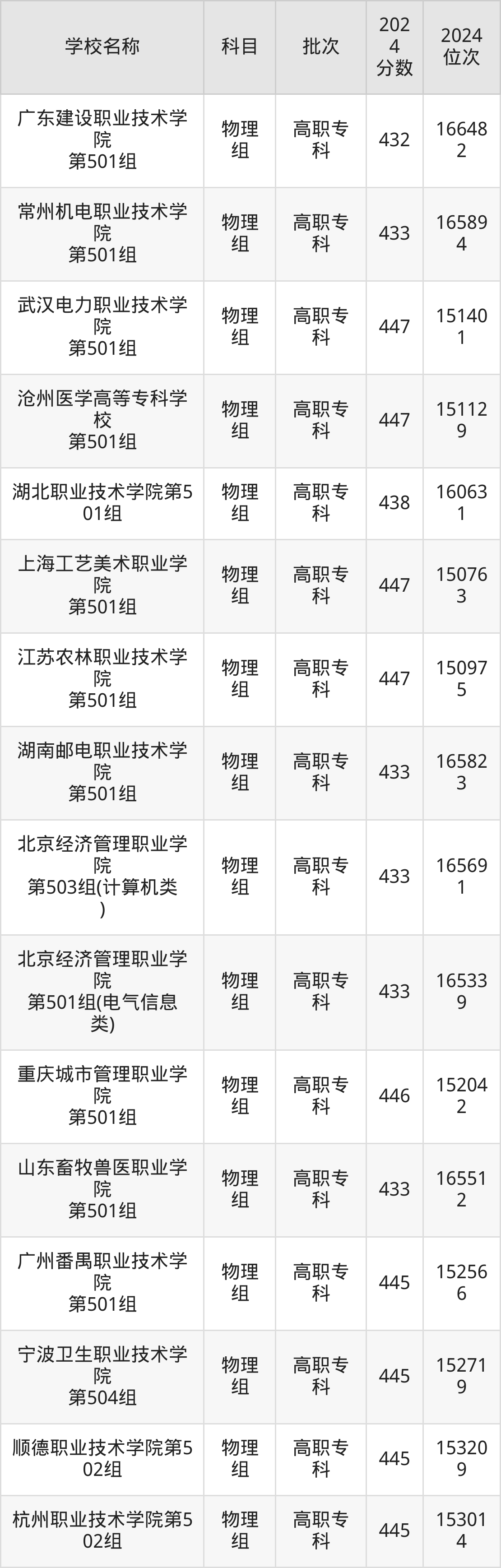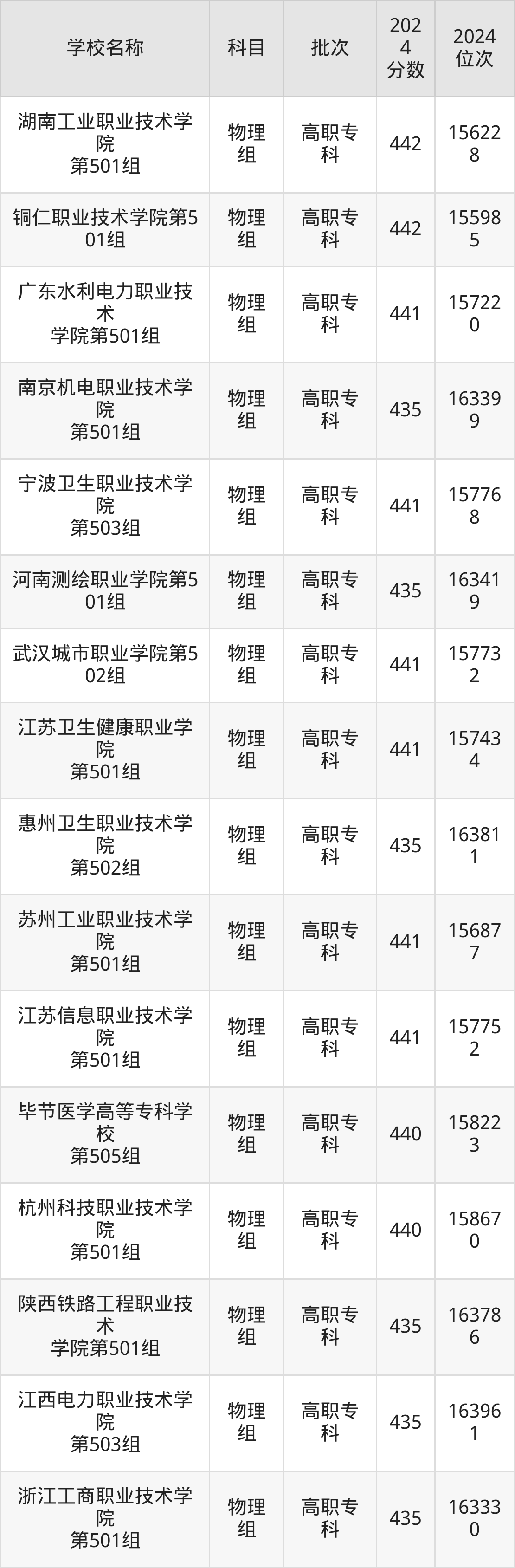 江苏高考物理组共有60所公办专科学校在430到450分之间录取,包含江西电力职业技术学院、江苏卫生健康职业学院、上海电子信息职业技术学院、重庆工程职业技术学院、南京交通职业技术学院、天津轻工职业技术学院、上海出版印刷高等专科学校、浙江经贸职业技术学院、安徽审计职业学院、江苏经贸职业技术学院。