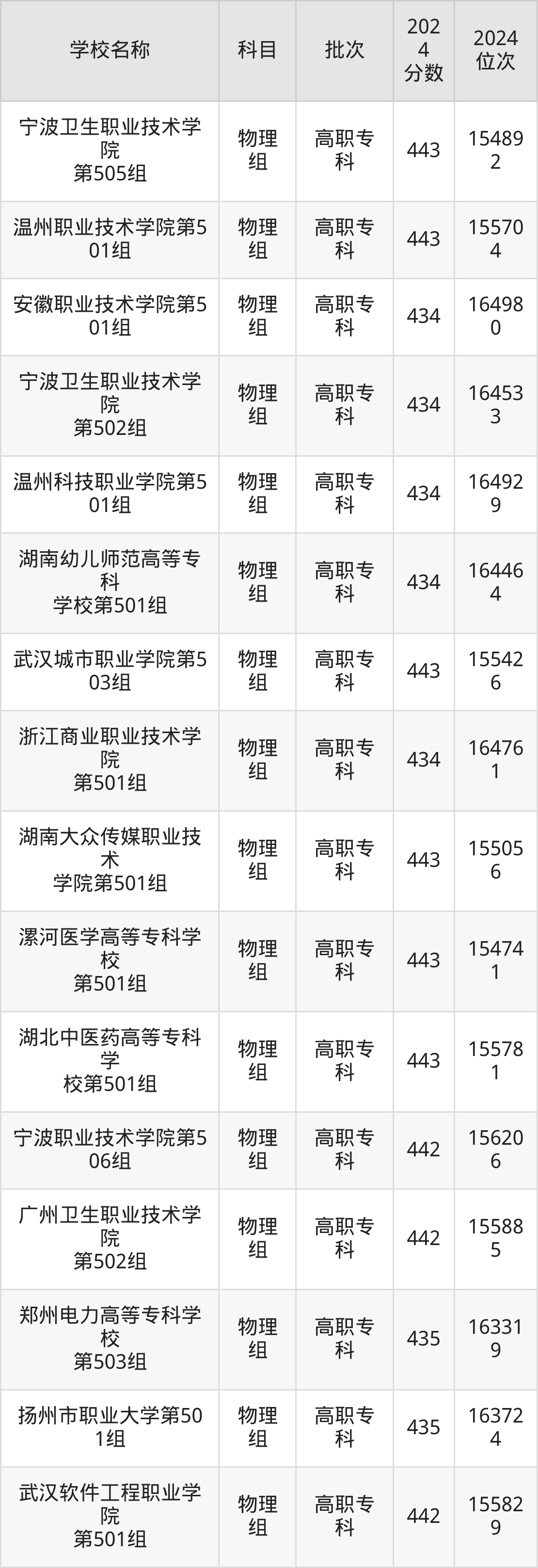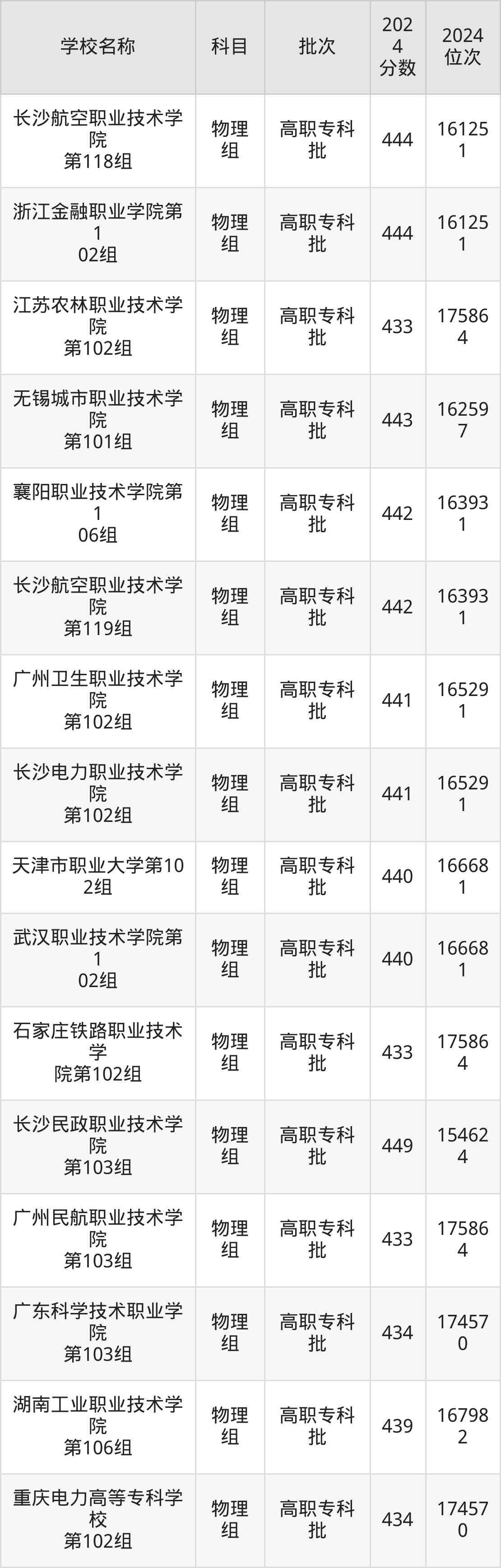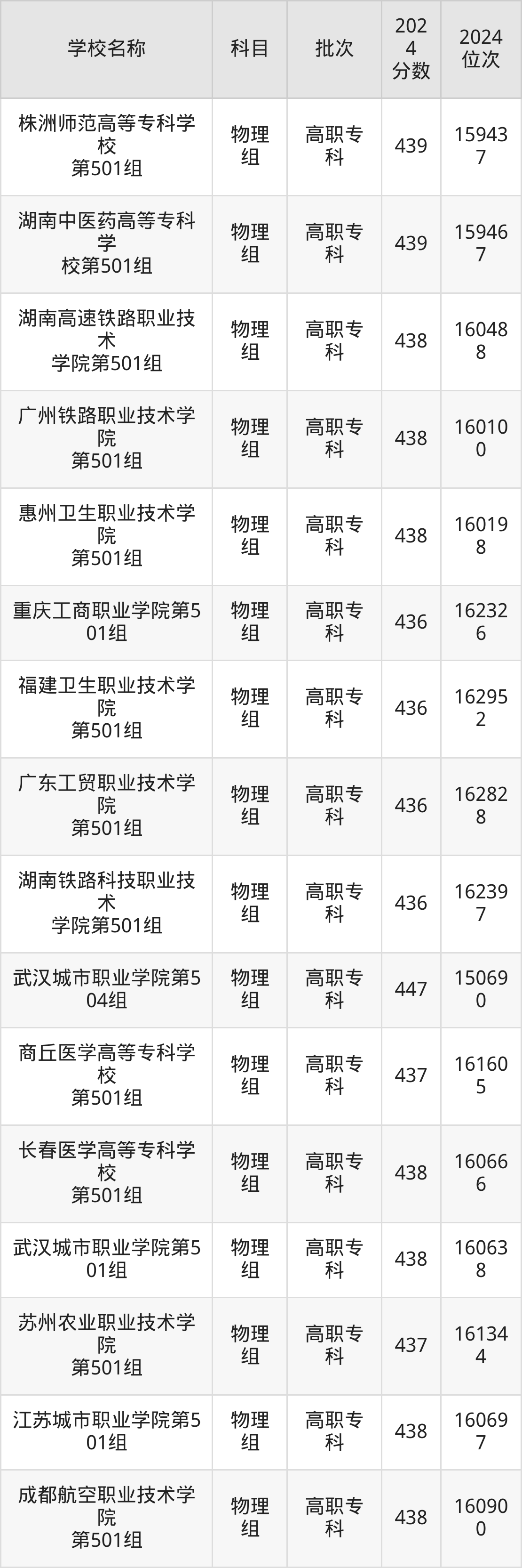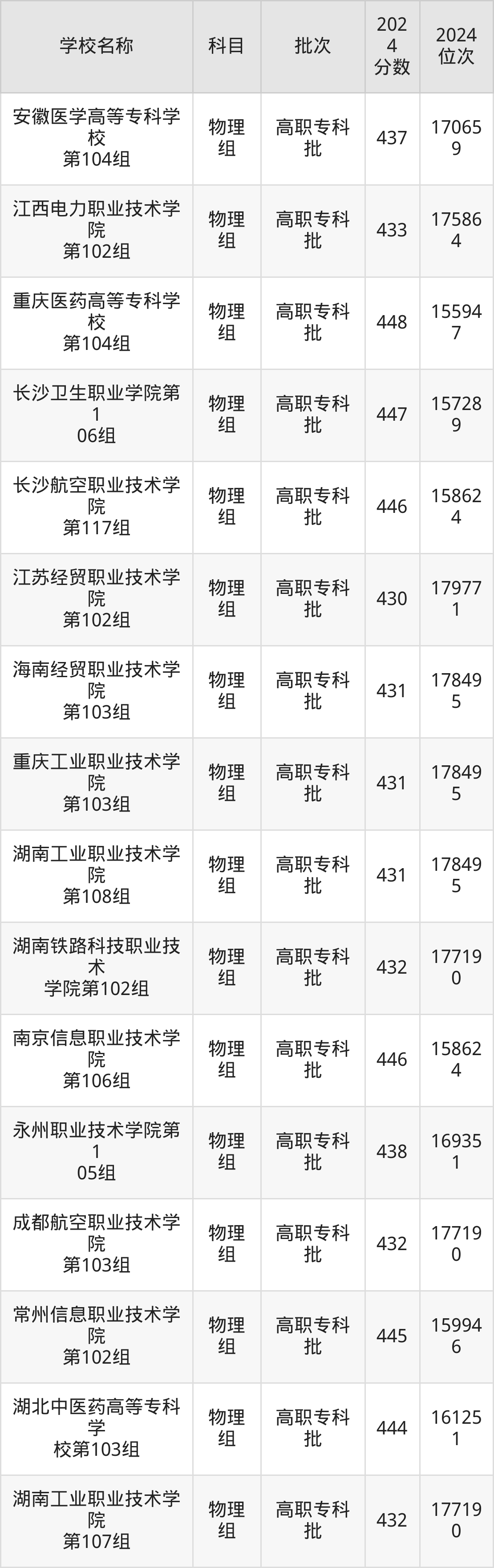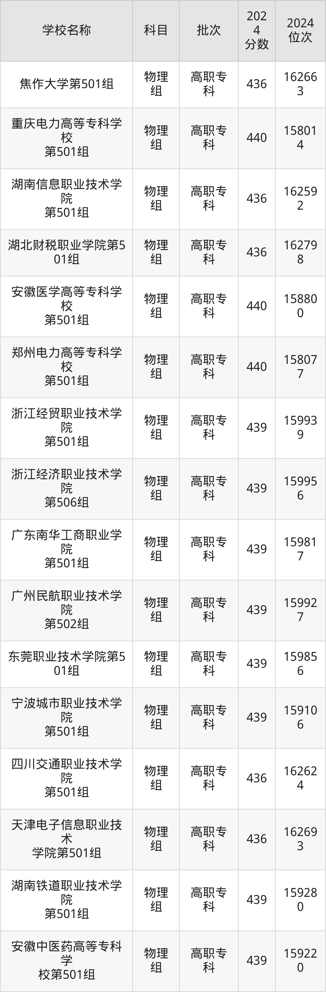 江苏高考物理组共有60所公办专科学校在430到450分之间录取,包含江西电力职业技术学院、江苏卫生健康职业学院、上海电子信息职业技术学院、重庆工程职业技术学院、南京交通职业技术学院、天津轻工职业技术学院、上海出版印刷高等专科学校、浙江经贸职业技术学院、安徽审计职业学院、江苏经贸职业技术学院。