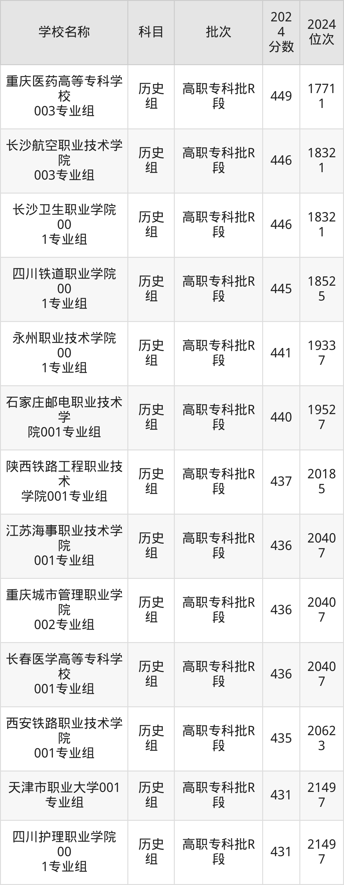 甘肃高考历史组共有13所公办专科学校在430到450分之间录取,包含重庆医药高等专科学校、长沙航空职业技术学院、长沙卫生职业学院、四川铁道职业学院、永州职业技术学院、石家庄邮电职业技术学院、陕西铁路工程职业技术学院、江苏海事职业技术学院、重庆城市管理职业学院、长春医学高等专科学校。