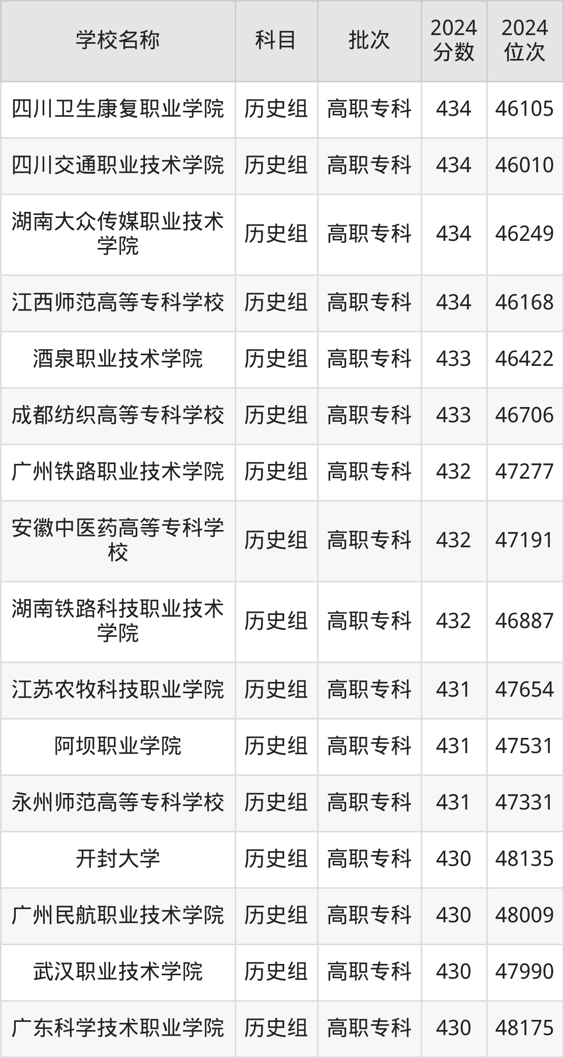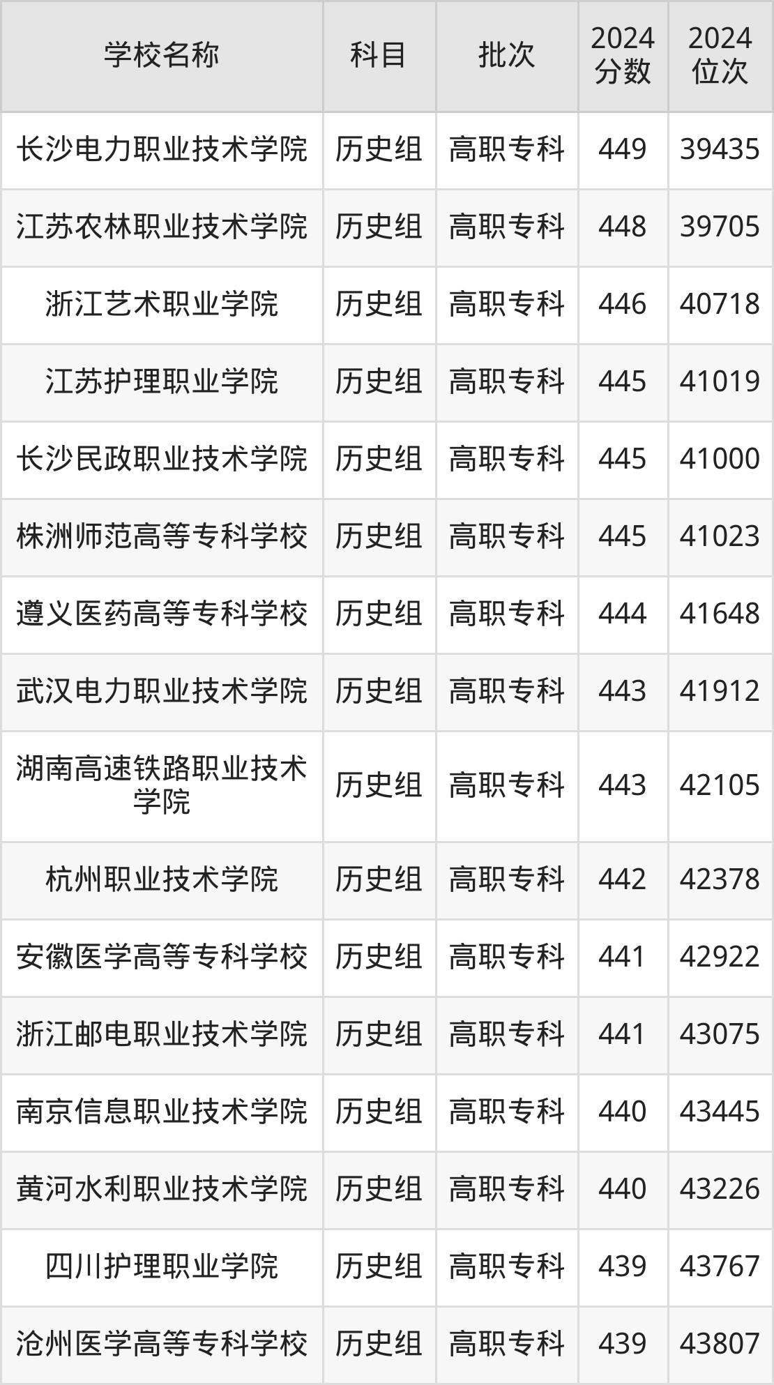 贵州高考历史组共有48所公办专科学校在430到450分之间录取,包含长沙电力职业技术学院、江苏农林职业技术学院、浙江艺术职业学院、江苏护理职业学院、长沙民政职业技术学院、株洲师范高等专科学校、遵义医药高等专科学校、武汉电力职业技术学院、湖南高速铁路职业技术学院、杭州职业技术学院。
