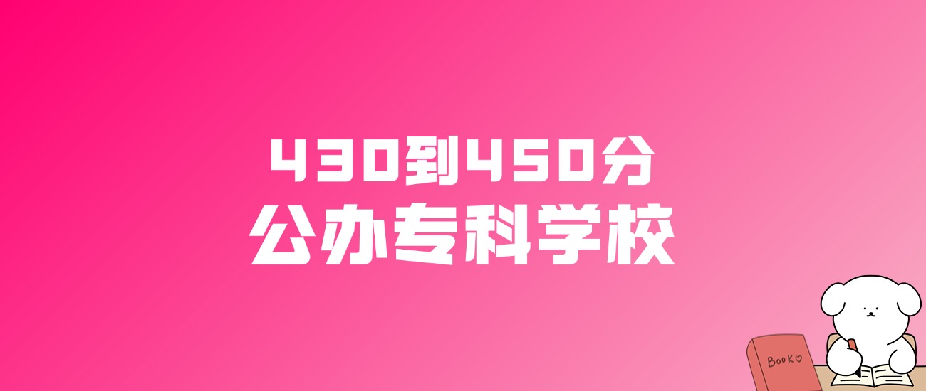 430到450分的公办专科学校有上海民航职业技术学院、长春医学高等专科学校、广东工贸职业技术学院、东莞职业技术学院、南通师范高等专科学校、武汉城市职业学院、无锡商业职业技术学院、宁波城市职业技术学院、重庆财经职业学院、福州职业技术学院等。